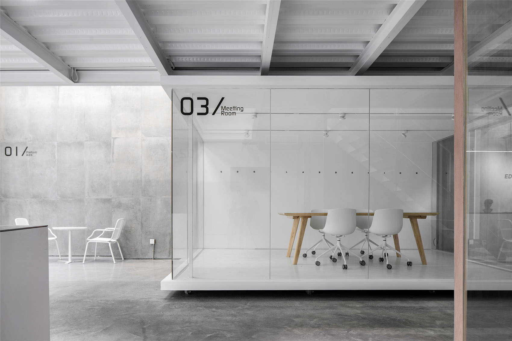 本设计的出发点是希望一层T.E.M.P艺术空间具备功能的多样性,可以用作会议、展览、办公、娱乐活动、及产品展示的功能。因此,我们设置了一个玻璃的可移动的会议空间(Meeting box),利用会议空间的前后左右的位置移动,产生出多种不同尺度的空间,达到多样的空间布置的可能性。