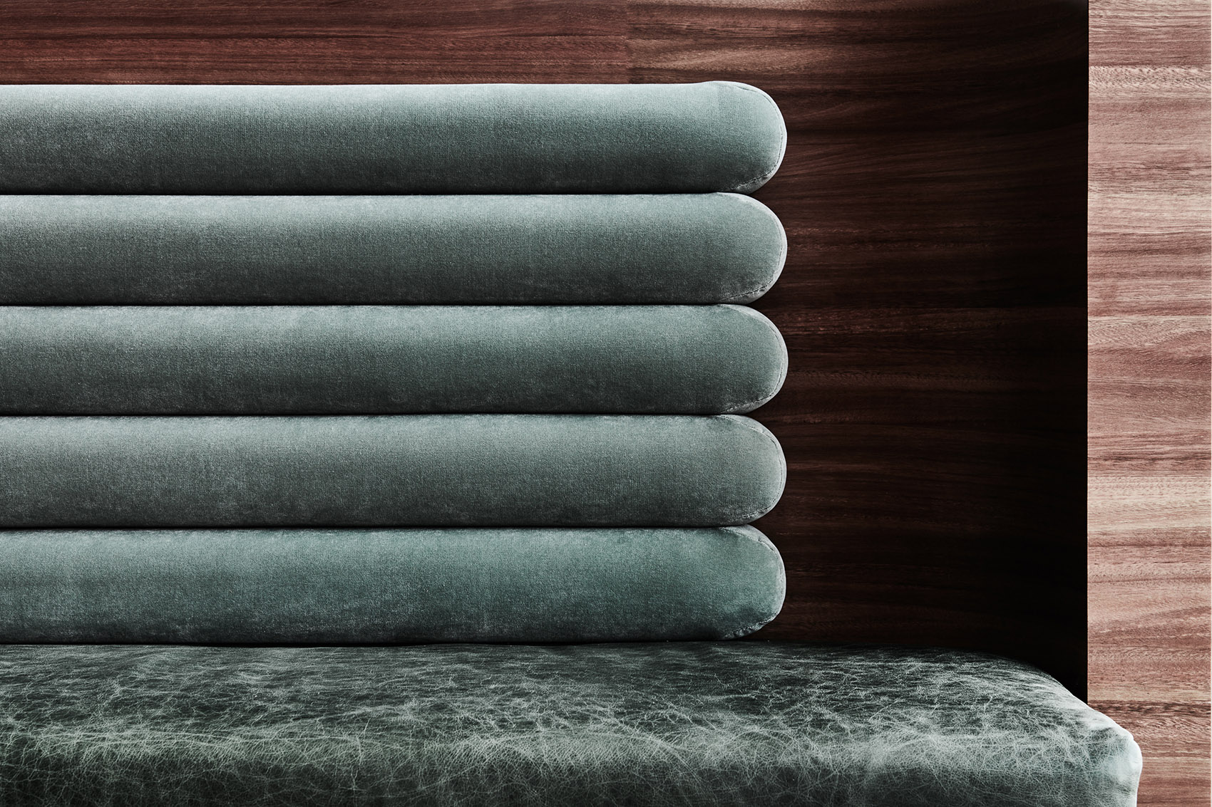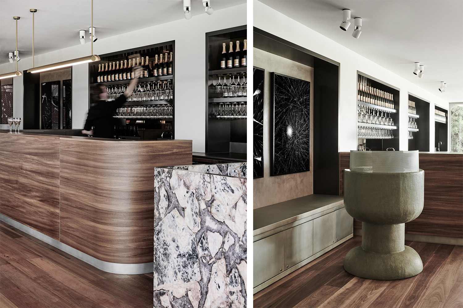 这些设计在向Chandon酒庄法式传统致敬的风格也有所体现中,同时设计也保留了一种年轻化的特征,这种年轻风格与香槟酒庄中相对新近成立的酒品种呼应。陈年皮革与天鹅绒搭配黄铜灯具的长条软凳,展露出一种巴黎小酒馆的美感。虽然设计师通常从国际化和能够经历时间考验的角度寻求灵感,他们也致力于与当地材料和制作者一同合作。斑点橡木地板和细木工为昆士兰本地艺术家“Dreamtime“大理石突出的纹理图案和印花纹理增添了柔软和温暖的特征。