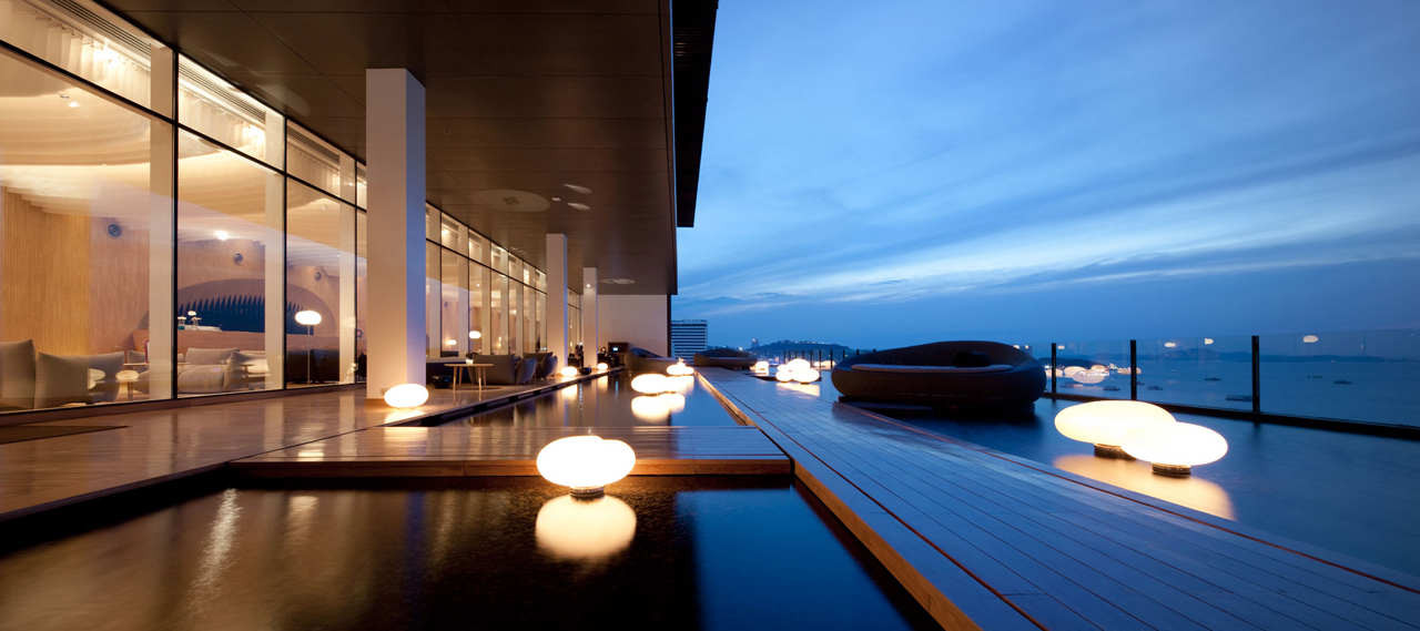 酒店大堂和酒吧的空间占据了17楼,位于下面熙熙攘攘的芭堤雅海滩上方。从一端进入空间,电梯门打开的时候,人们会进入一个宽敞的大厅区域。建筑影响了整个天花板平面,其动态波线,增加游客对海边的运动的联想。纤维织物安装在天花板上成为一个空间的主要亮点,而在地上简单元素提供了一个宁静的气氛。
