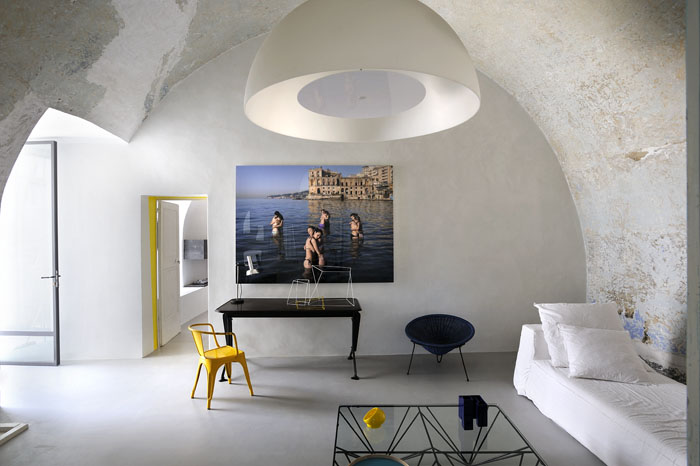 在公共客厅中,完美的现代家具与露出古老时间痕迹的墙壁—不同深浅蓝色和水绿色石灰层,优雅的并置着。墙上挂着一幅海景图画,对面安装上镜子,从镜子中也能看到“海景”。客厅里面的家具都是精心选择的现代家具。
