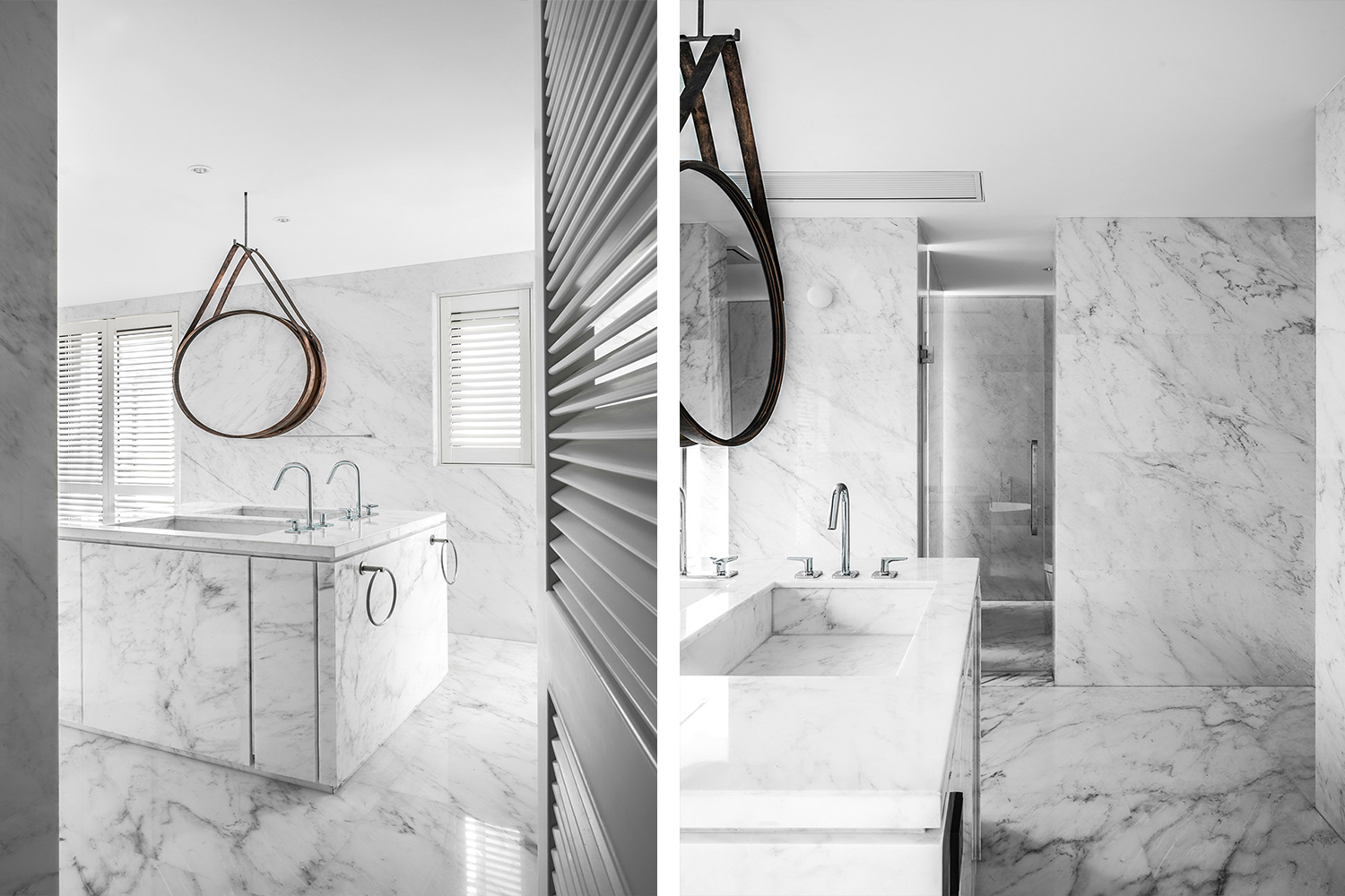 三楼为主卧房楼层,中间主浴所在的位置如同隐性的BOX,将主卧房区分为睡眠区及更衣区。而浴室内部的中岛洗脸台的设计,其实体的BOX规划,使得虚、实的盒体空间概念得以更精淮的落实。整体设计质感低调而内敛,空间拥有了岁月静好的力量,使家人们的生活获得了不同的满足。