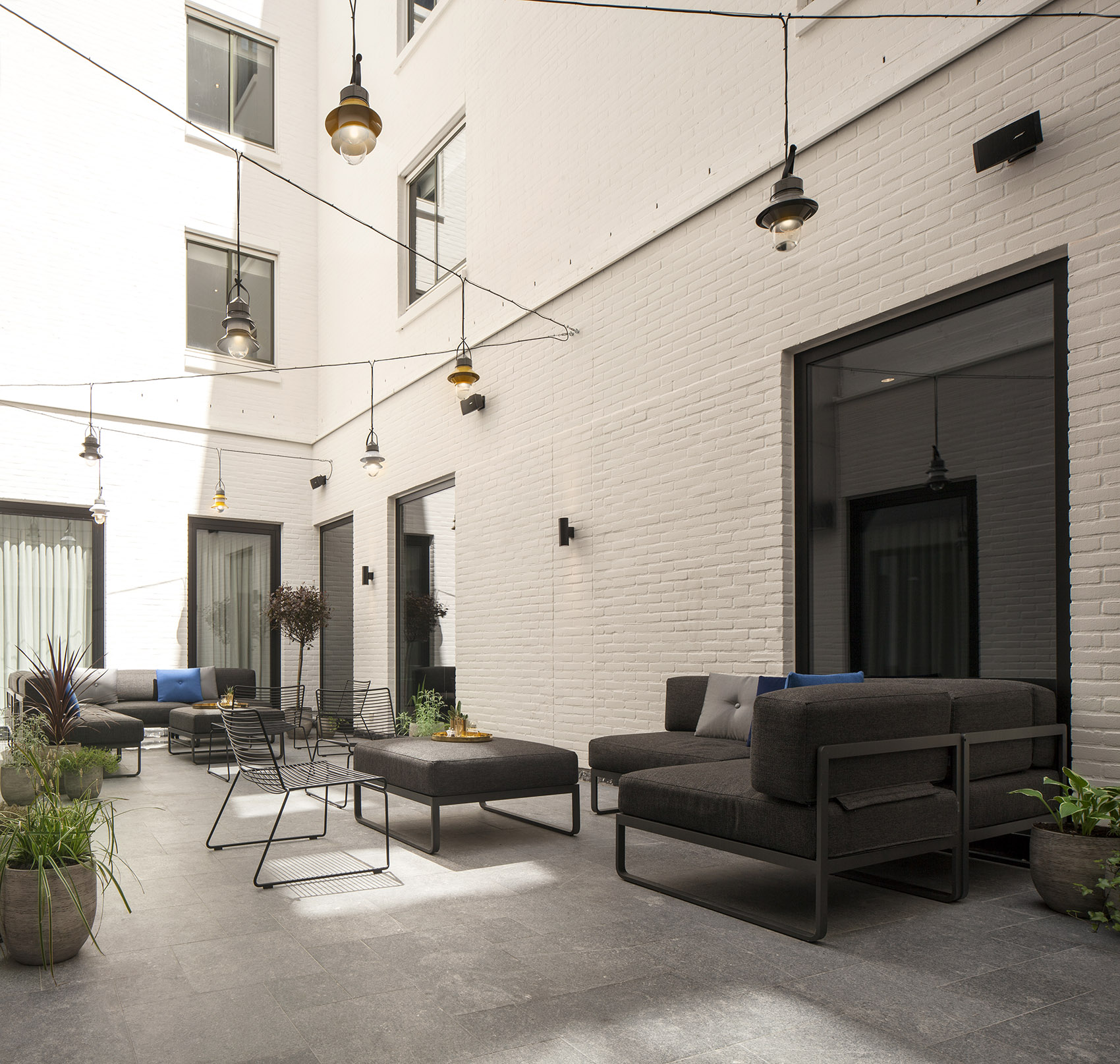 concrete公司在荷兰阿姆斯特丹完成了一座风格现代的独特城市酒店-INK,为那些希望定义自己的时间,与城市以及环境紧密共处的游客提供别具一格的服务。地身处历史建筑核心区的酒店建筑前身乃是报社总部和打印店的所在地。如今新兴的INK酒店以开放的面貌应对城市,采用巨大的入口,以及与入口相连通的内庭院打造出城市公共空间延伸区,模糊建筑内外的区别,邀请人们进入酒店对外开放的餐厅与酒吧。公共功能安排在地面与地下,楼上部分用作酒店客房。