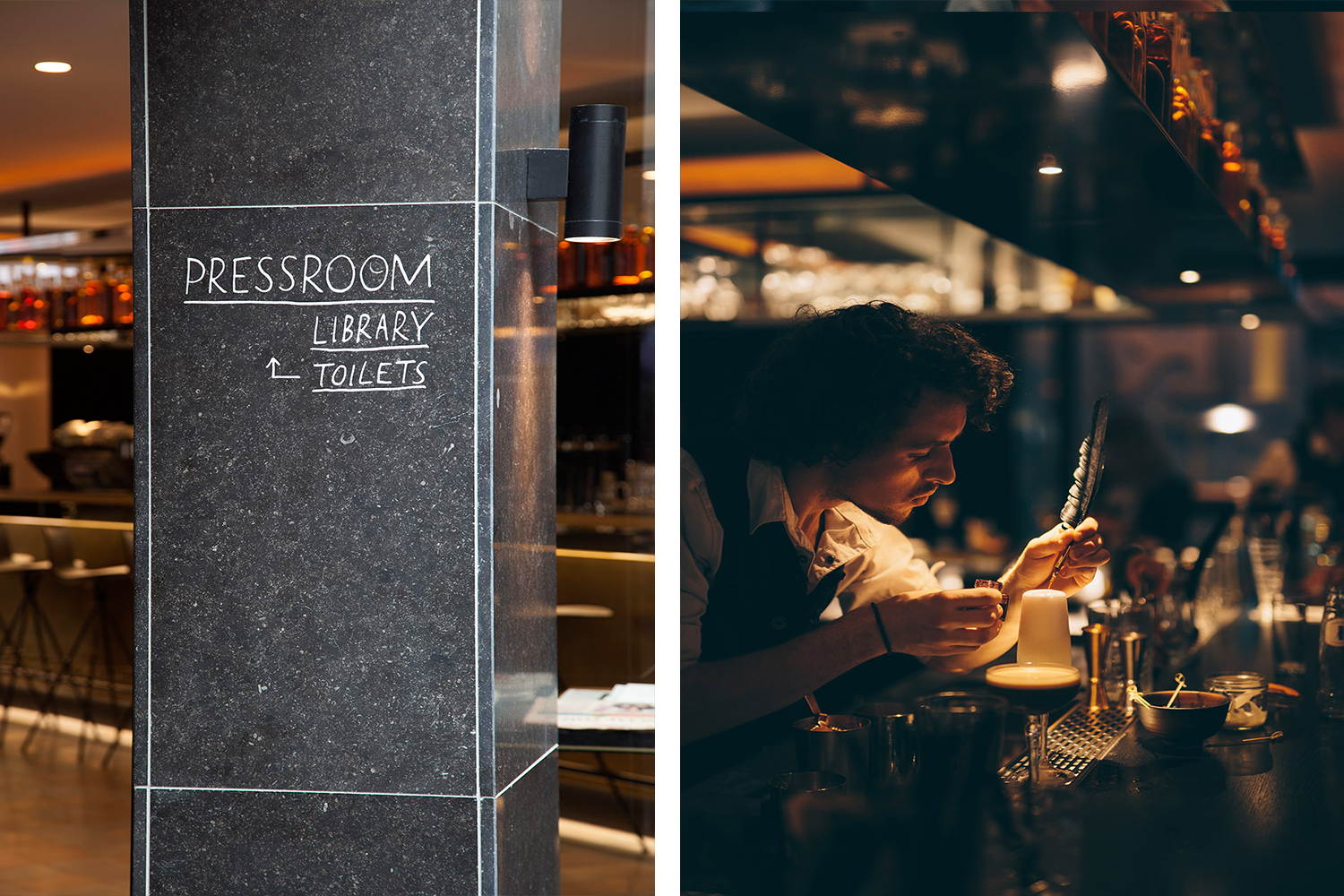 为了与历史上的打印店相呼应,餐厅沿墙布置了32米长的,打印店常常配置的木柜子,这些木柜子在餐厅中可被用来储存酒以及各种服务用具,还有些被放置了打印店的幽默,纸张,旧打印机。餐厅尽头是开放式厨房。整个空间采用温暖的黄铜色和琥珀色作为色彩基调。
