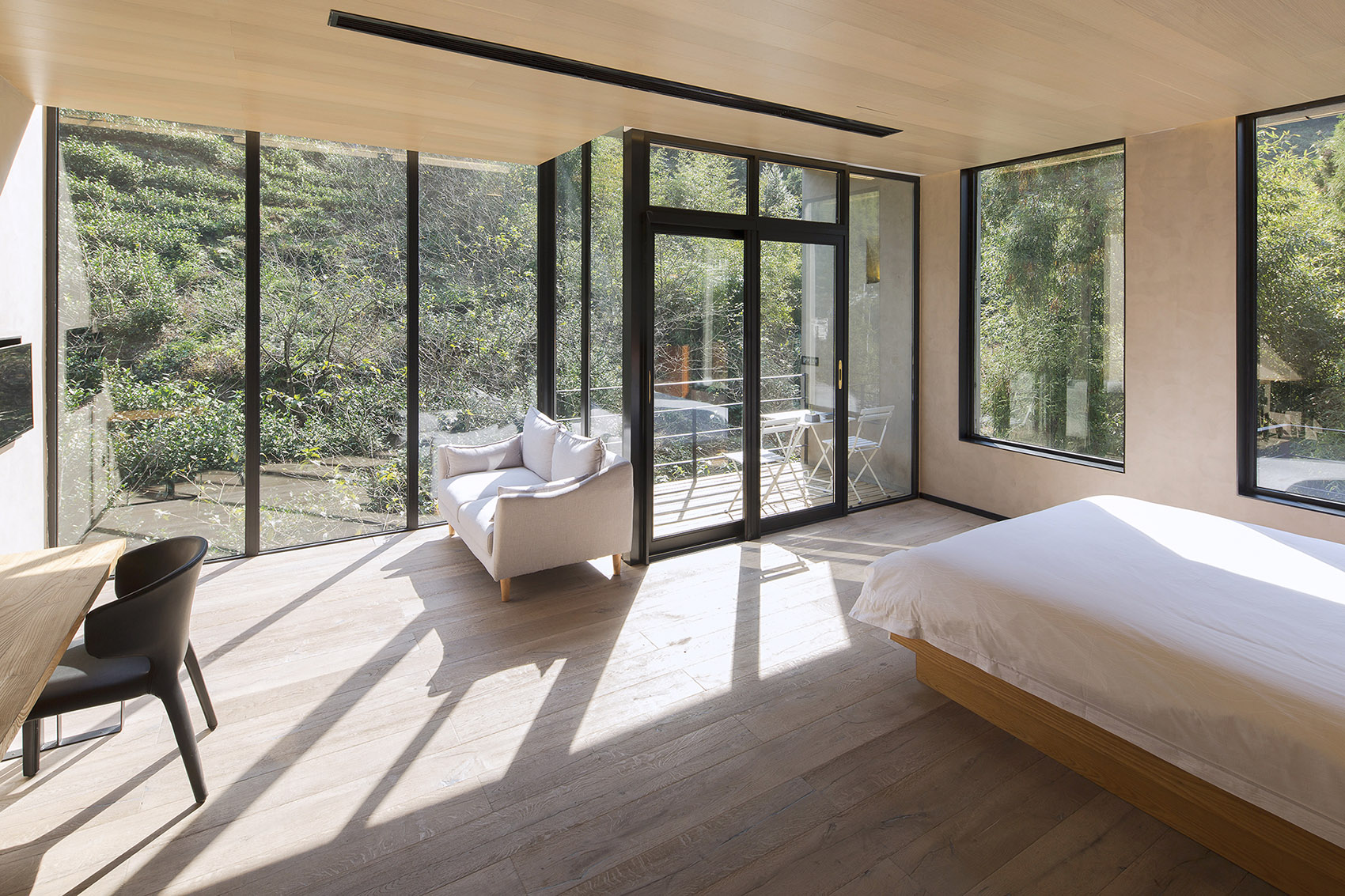LOFT房间是最大一间客房,可供亲子与家人一起入住。黑色极简的楼梯贯穿上下,在相互保有私密性的同时又可以相互走动,增添气氛。卫生间白色的色调,干净简练。直面竹林,可以享受泡澡沐浴时的野趣。夏日的夜里满天星辰,呼吸着山间清润的空气,能忆起童年的种种趣事。度假酒店的感受,大抵因是如此吧