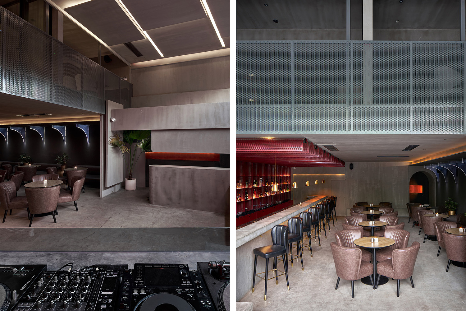 从入口空间走出进入内部,空间突然拉高至六米, 整个混凝土结构空间非常强的攻击性,DJ台区域延伸局部台阶错落可满足人随意坐,站,跳等肢体行为。灰色的空间中穿插着一排红色的条光,并且根据音乐编程各种变化效果,这个区域被定为Social Area。