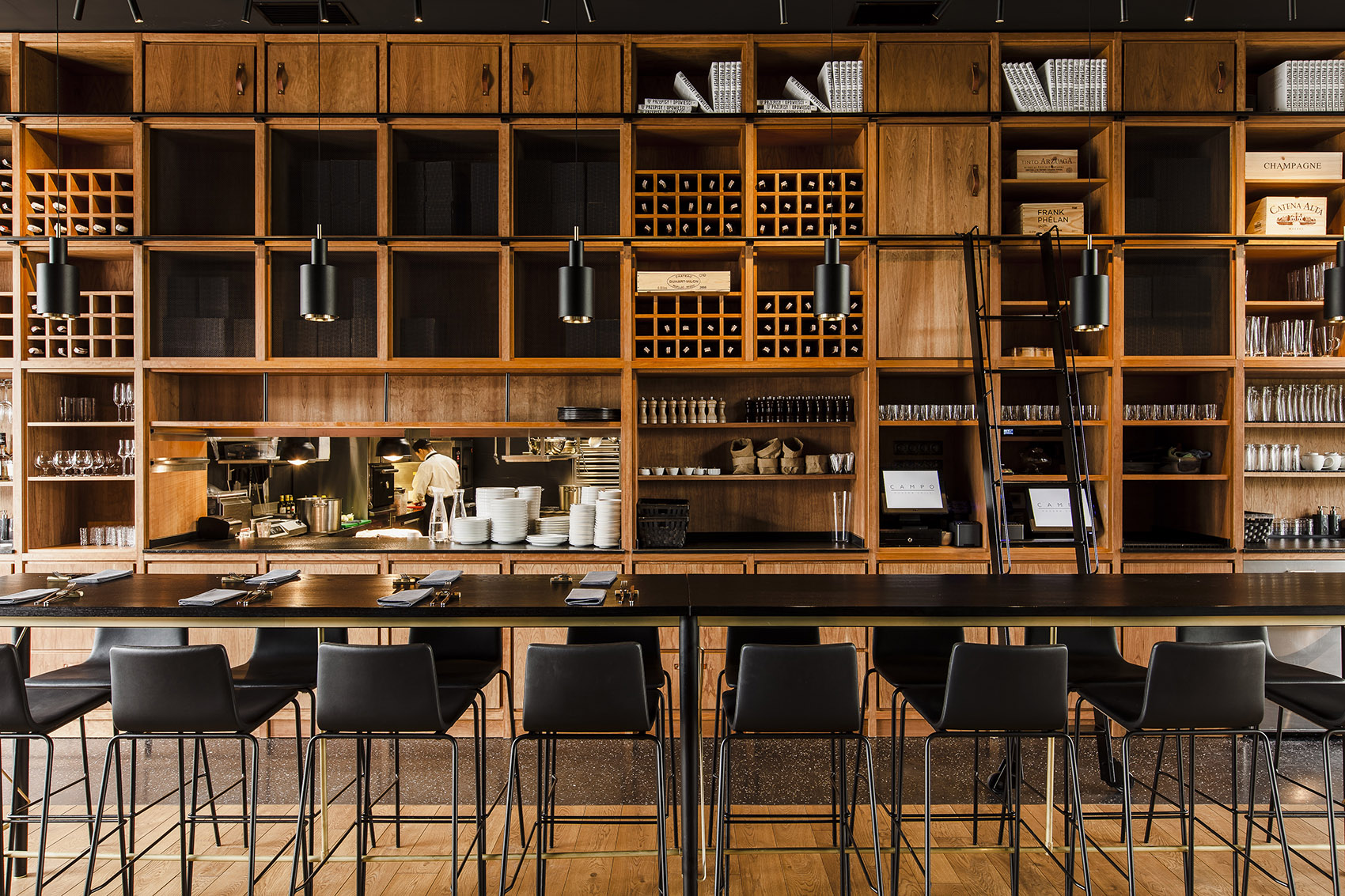 在伊比利亚-美洲语言中,餐厅的名字是指适合种植庄稼或养牛的土地或土地,暗喻着自然和饭店的美食标准。不仅在美学、菜单和餐厅名称上,而且在功能布局上都能看到真诚和简洁。两个大的、完全釉面的立面将房屋划分成清晰的分区。房前有接待区和单空间餐厅。厨房、服务室、客房和衣帽间,全部隐藏在木制的小隔间里。小隔间几乎是一个14米长的架子,向着餐厅打开。对顾客来说,货架象征着开放,营造出温馨的氛围。它就像吧台一样,里面存放着红酒,工作人员在立面准备饮料、切面包并准备小吃,并通过大型的服务窗口将餐厅和厨房连接起来。