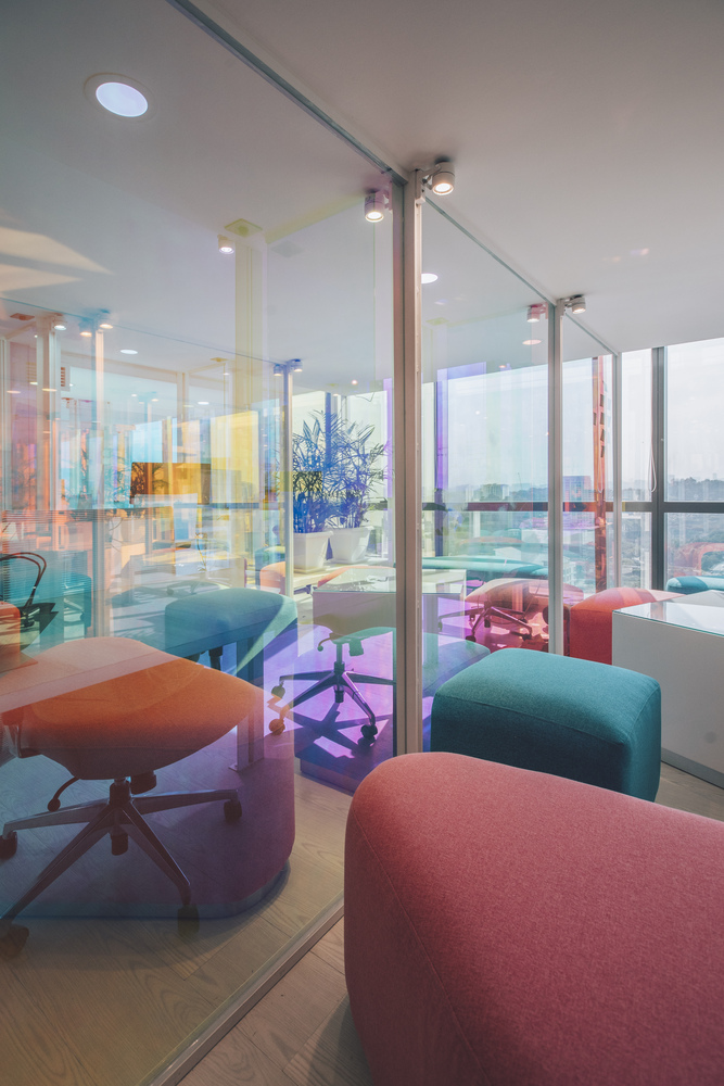 工作区被视为“光之殿”,它的设计是关于多向色性(一种光学现象,物体颜色随观察角度产生变化)和其与用户体验和生产率的动态关系做的建筑练习。在覆盖办公室的多层钢玻璃框架结构使用3M二向色薄膜并结合攀爬架的可玩性反映了对圣家族大教堂彩色玻璃的现代理解。