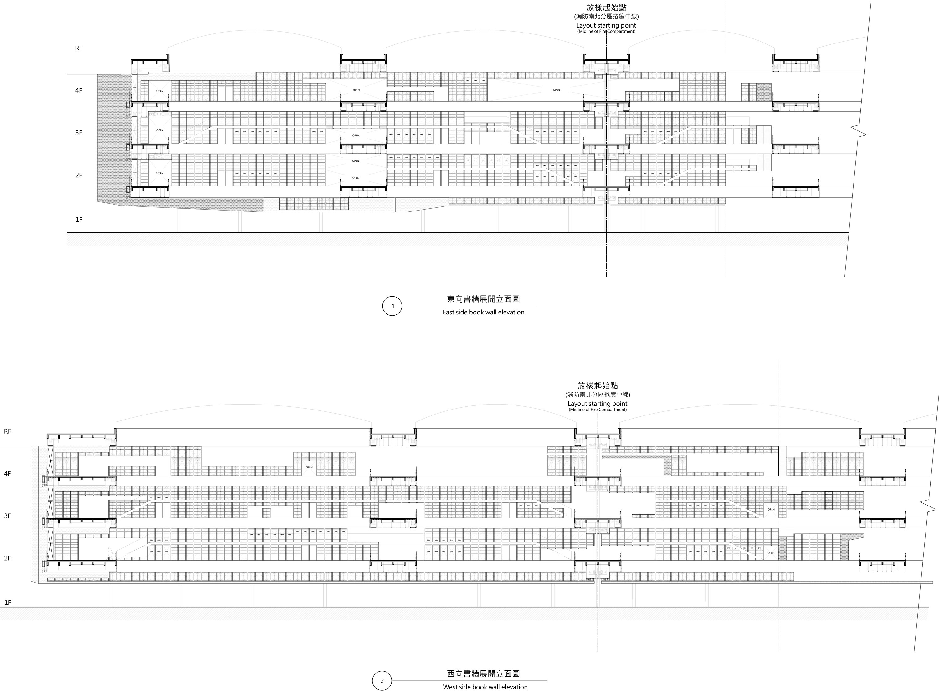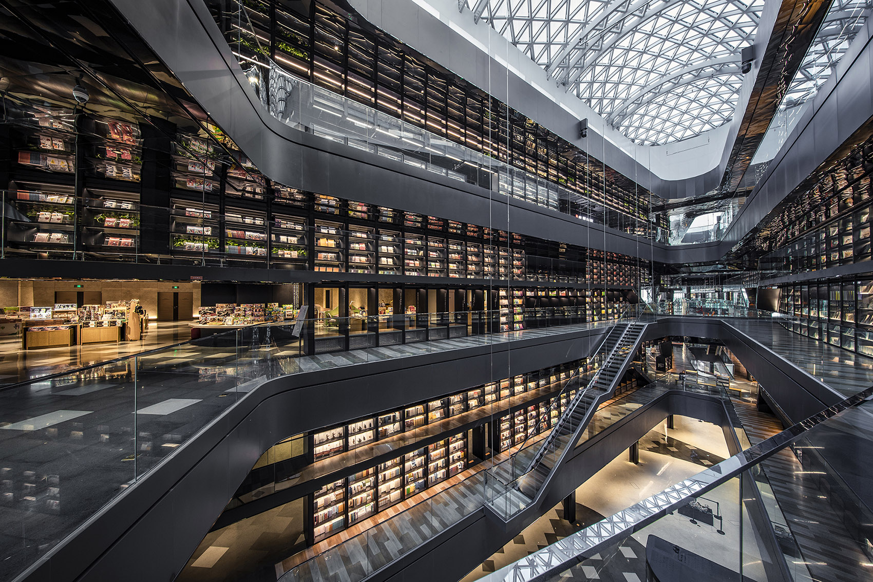 承载数十万册图书的书墙,以钢结构和透明玻璃为材质,除了视觉穿越,也让光线自由漫射在挑空区域,与空间实体交迭出各种形式的语汇。阅读者穿梭在书墙与挑空之间,成为这殿堂景象的一部分。