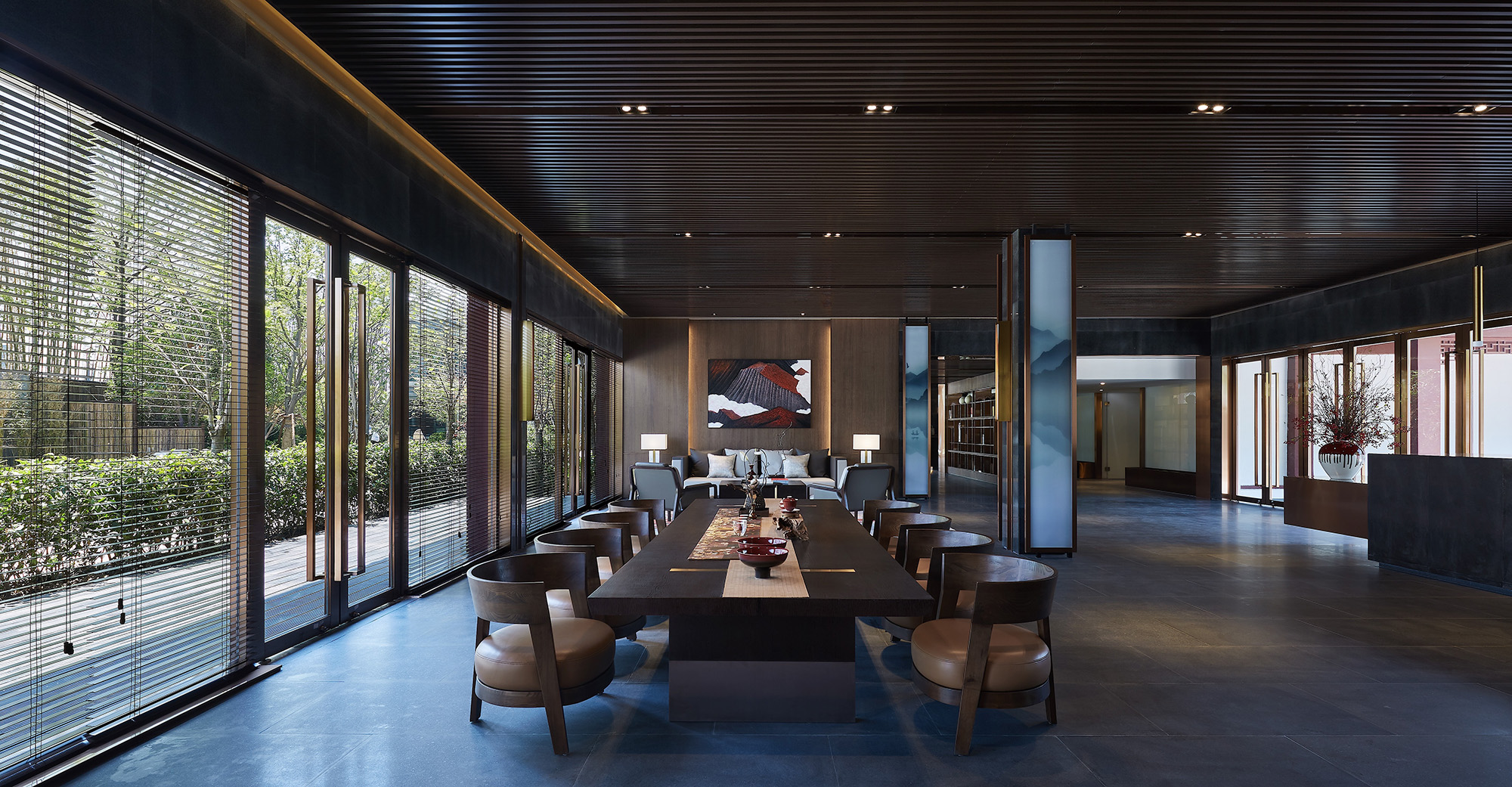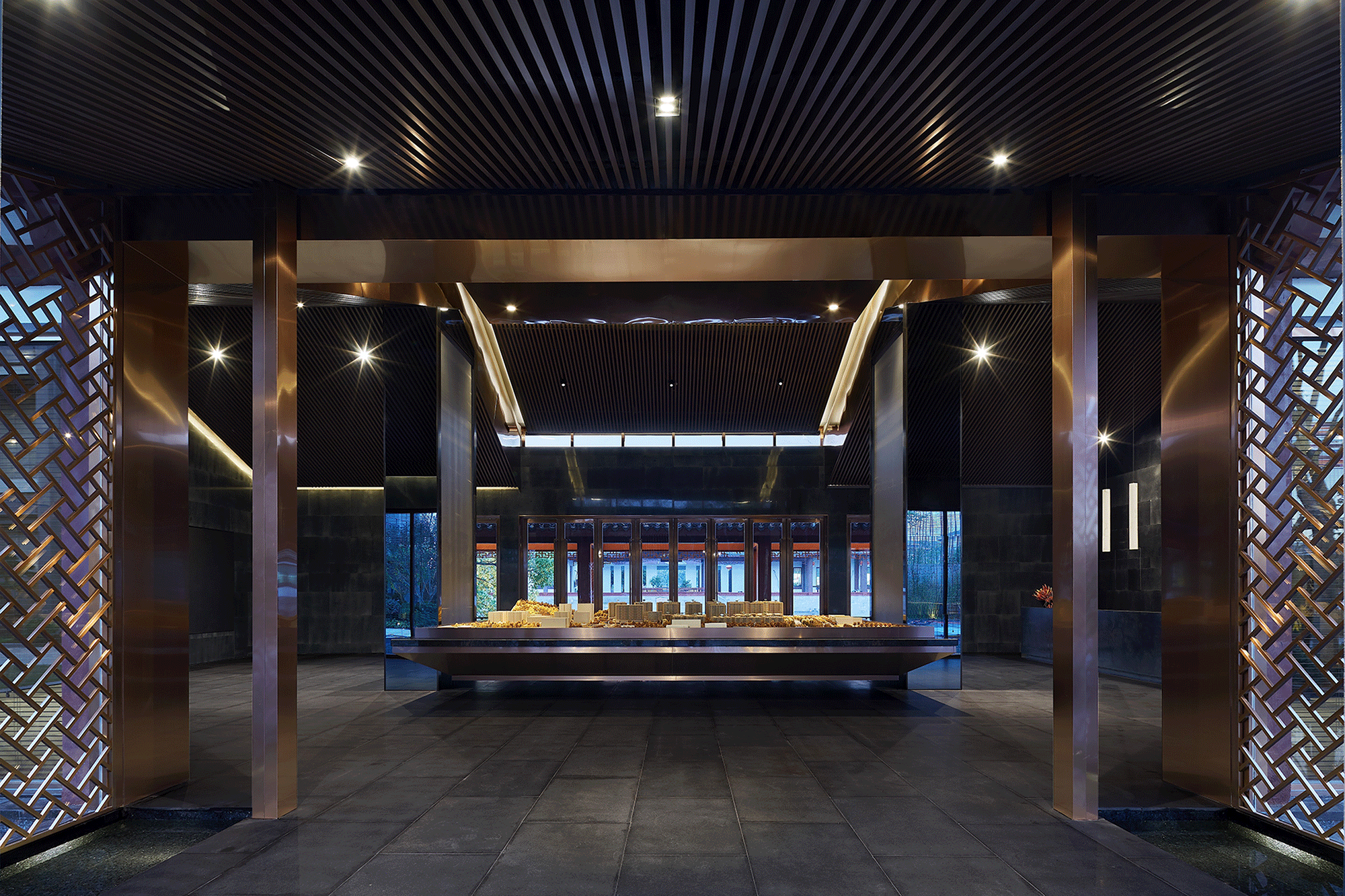 大堂内注重材质的克制与平衡,大面的黑色基底将仪式感与雄浑气势渲染而出。金属镂空格栅显江南韵律,斜屋顶及顶端挑空区窗口,则是对传统物态的解构与再造。剥开视觉表象,映射出来的是现代、东方、艺术、自然等内核元素,给宾客无与伦比的感官体验。