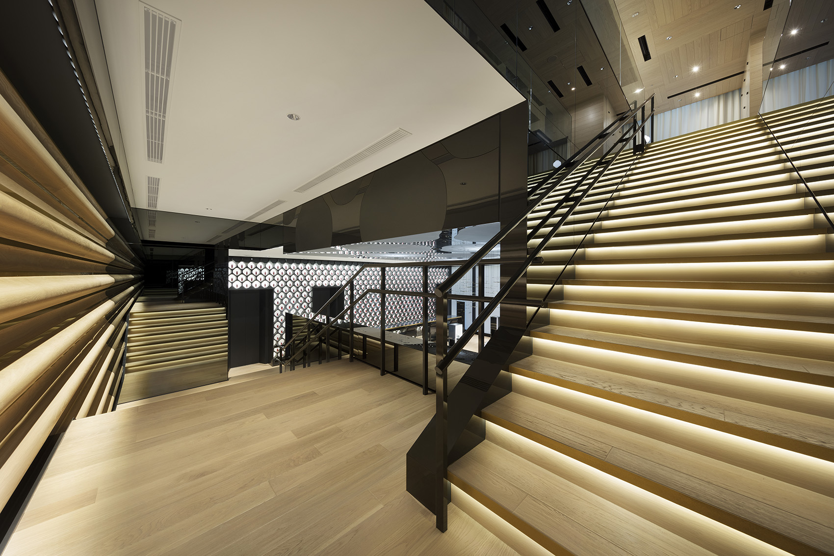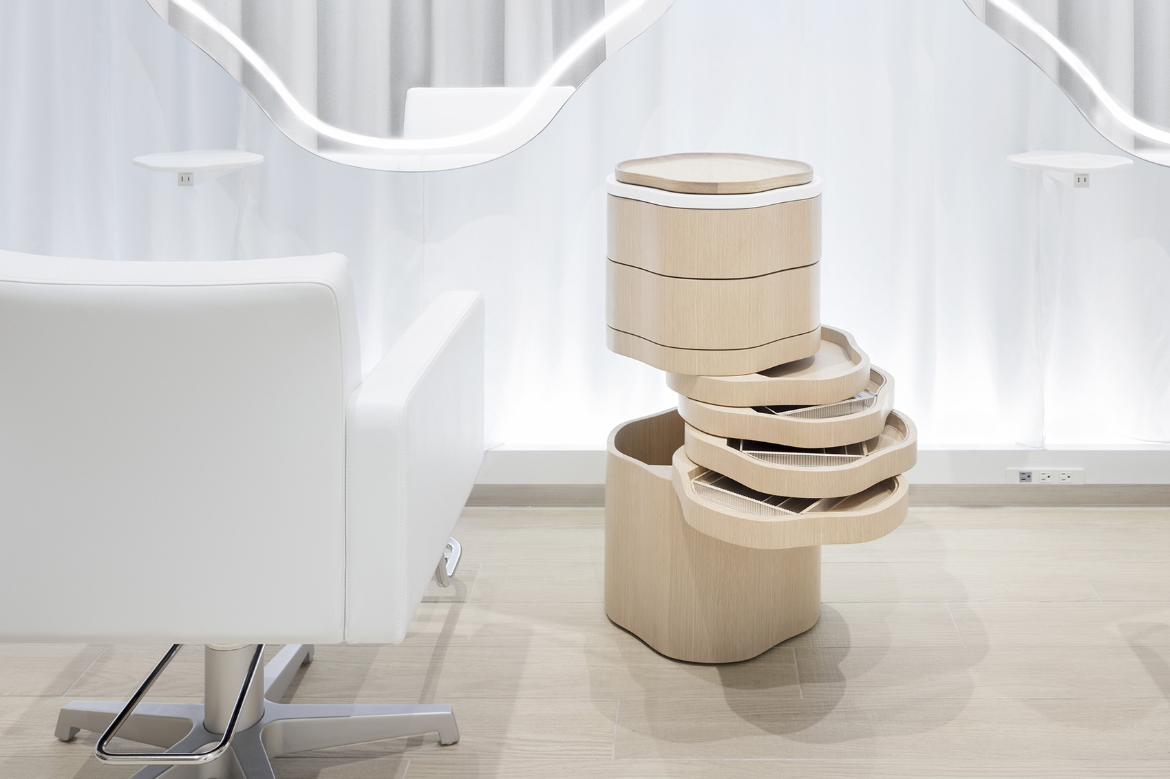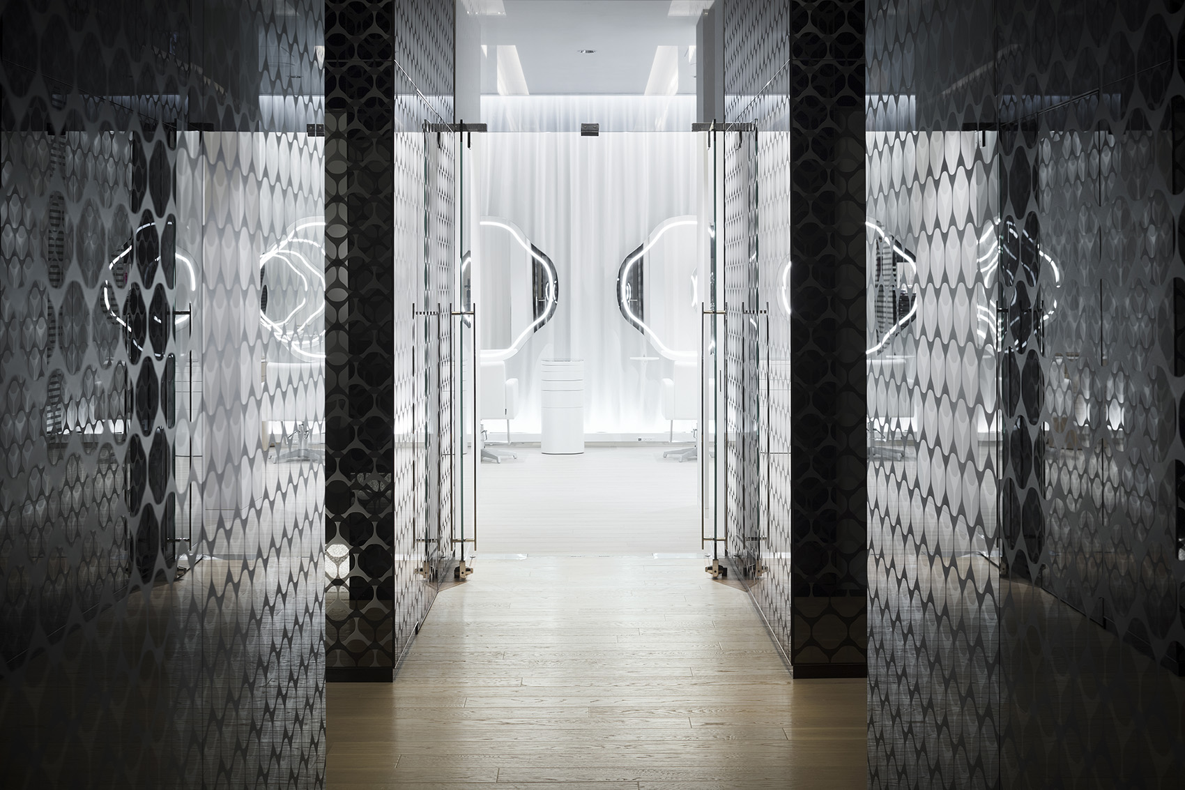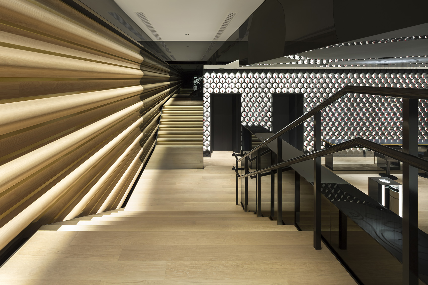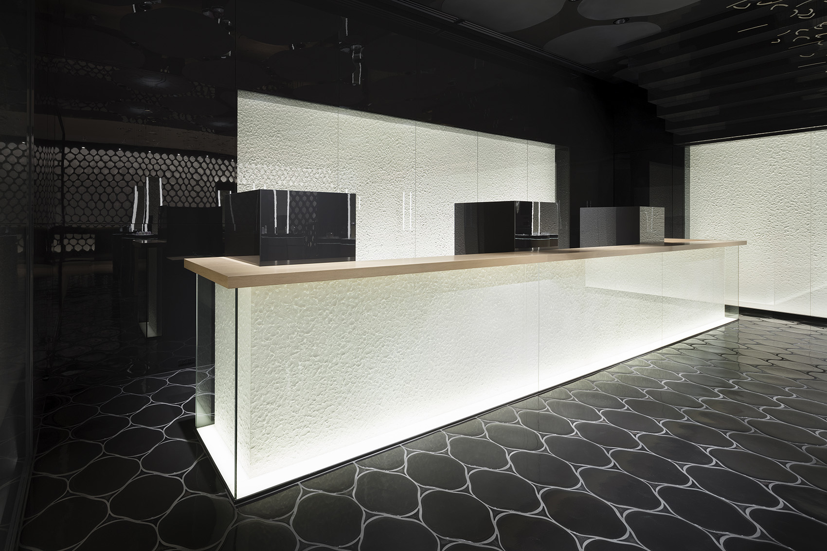 设计中的图形元素来自山茶花的花朵形状,这也是资生堂自1915年以来便一直使用的品牌标识。整个空间中充满了源自日本传统工艺的主题:模仿竹子的立柱造型、制造和纸时常用的镂空工艺、传统竹篮的编织图案以及传统复合纸的纹理等等。