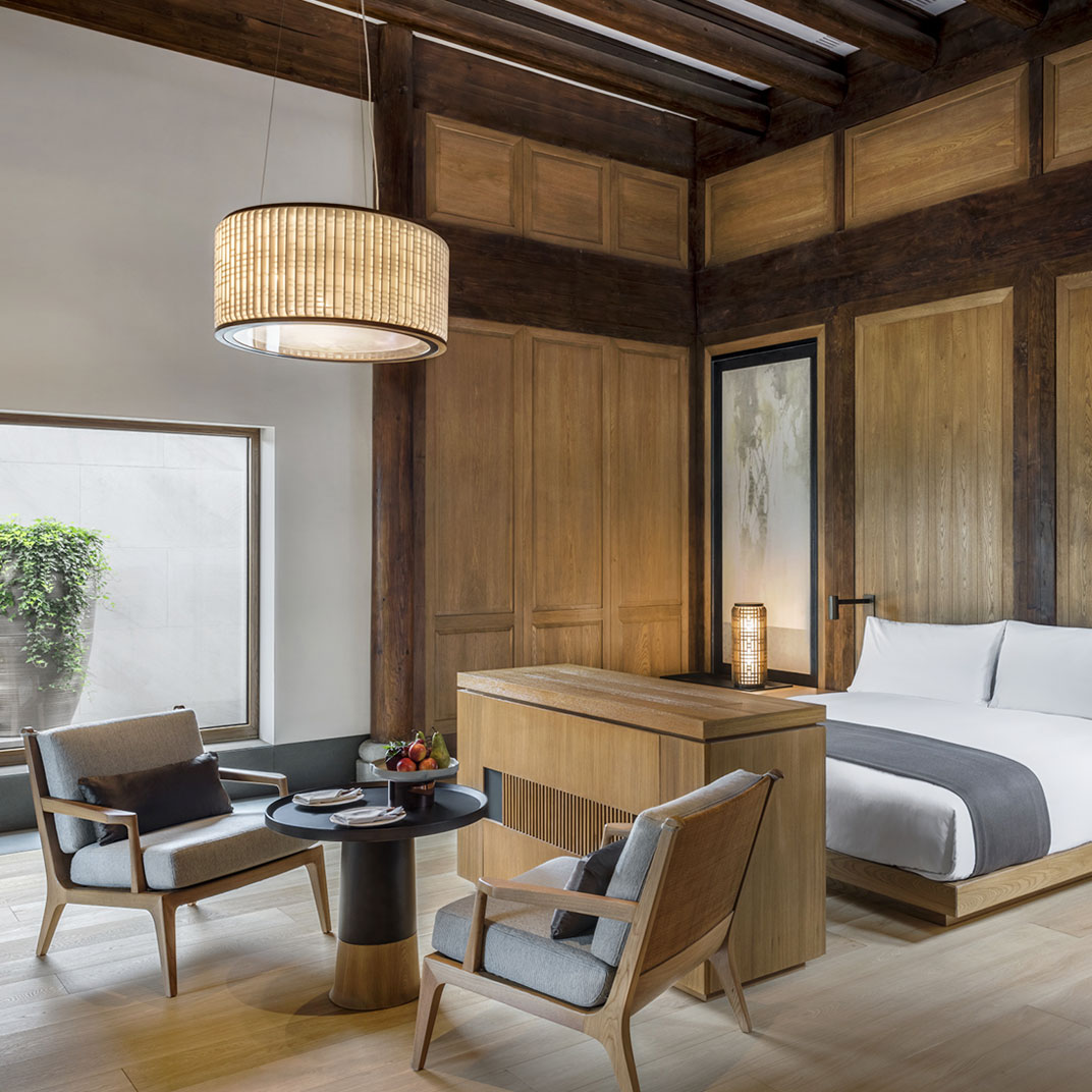其实,于设计而言,新与旧的融合,有时更像是一场戏剧的编排。古院新叙、时光的精义、院的辉蕴,都在关于“居”的潜思与构建中次第展开。而除古宅之外,养云安缦另有新建的24间套房,它们与古宅建筑的历史感相得益彰,呈现出一种默契的动态平衡。新建套房拥有轩敞明亮的卧室和起居空间,设计感拒绝繁复、保持简约,精致的木质装饰体现了安缦标志性的极简主义风格和审美。