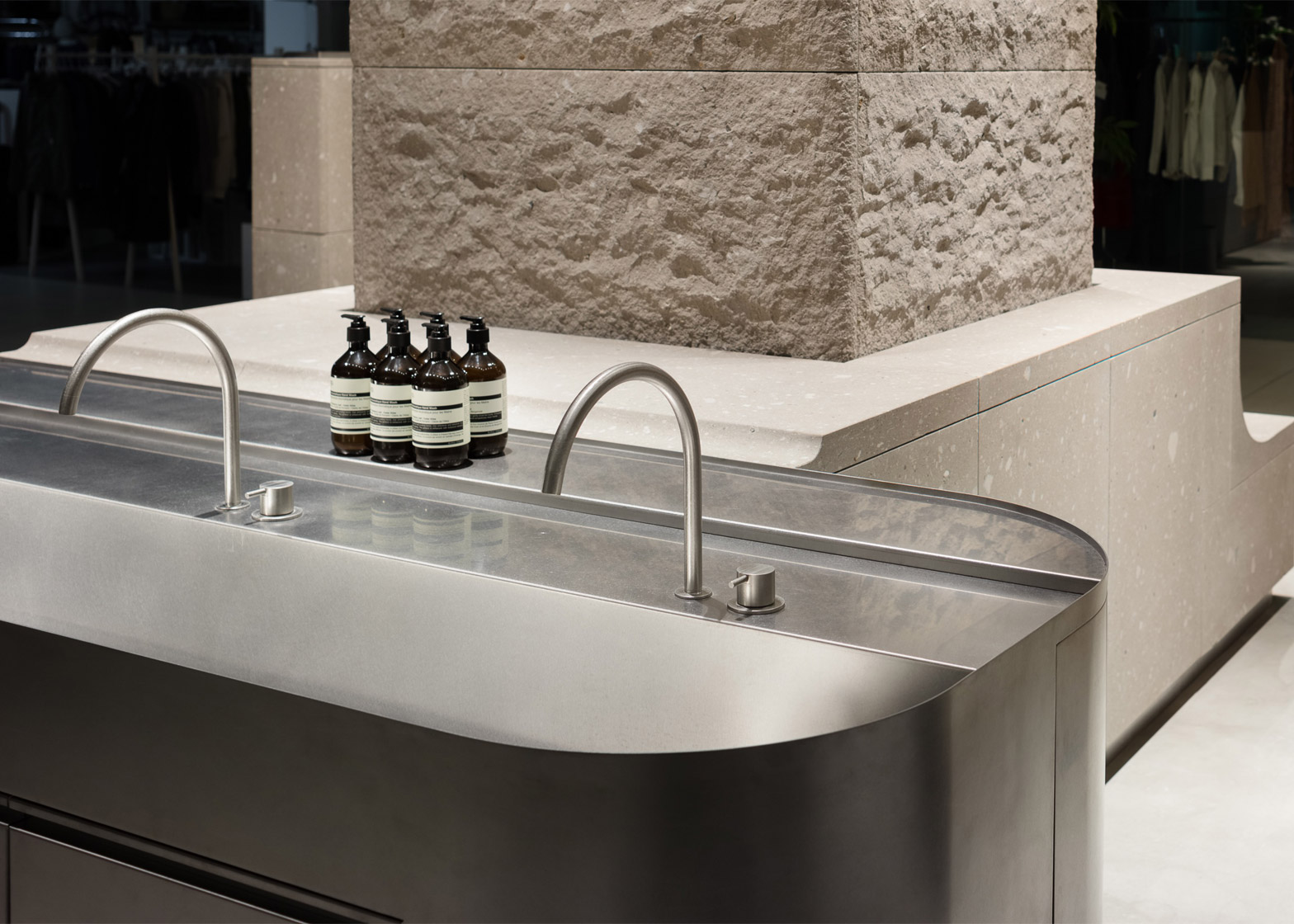 用于覆盖墙壁和主要柜台的主要材料是札幌自由石(一种火山石),建筑师称其已被用作该地区的建筑材料已有100多年的历史。不锈钢被用于在整个商店中创建展示架和其他功能性固定装置,包括演示水槽,这是澳大利亚所有品牌商店的重要装置。
