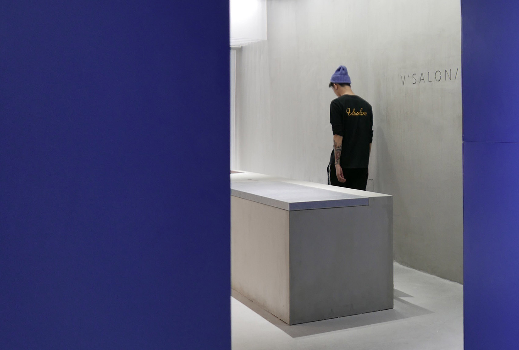 这是一个在商场原安全通道基础上改造的理发店。从设计到施工结束的周期大概一个月的时间,时间很短,限制很多,要求很多。不能有任何的固定隔墙,所有空间中可见的墙体都是临时的必须可移动的。包括吧台,镜面,柜体都是可移动的。在有限的面积里,需要满足员工休息区,洗头区,vip护理区,杂物收纳间,等待区,不少于12个的理发位,和足够的收纳等等。设计以块面的穿插,镜面的反射来趣味整个空间,蓝色作为对比和跳跃,在灰白的空间中去做出打破。