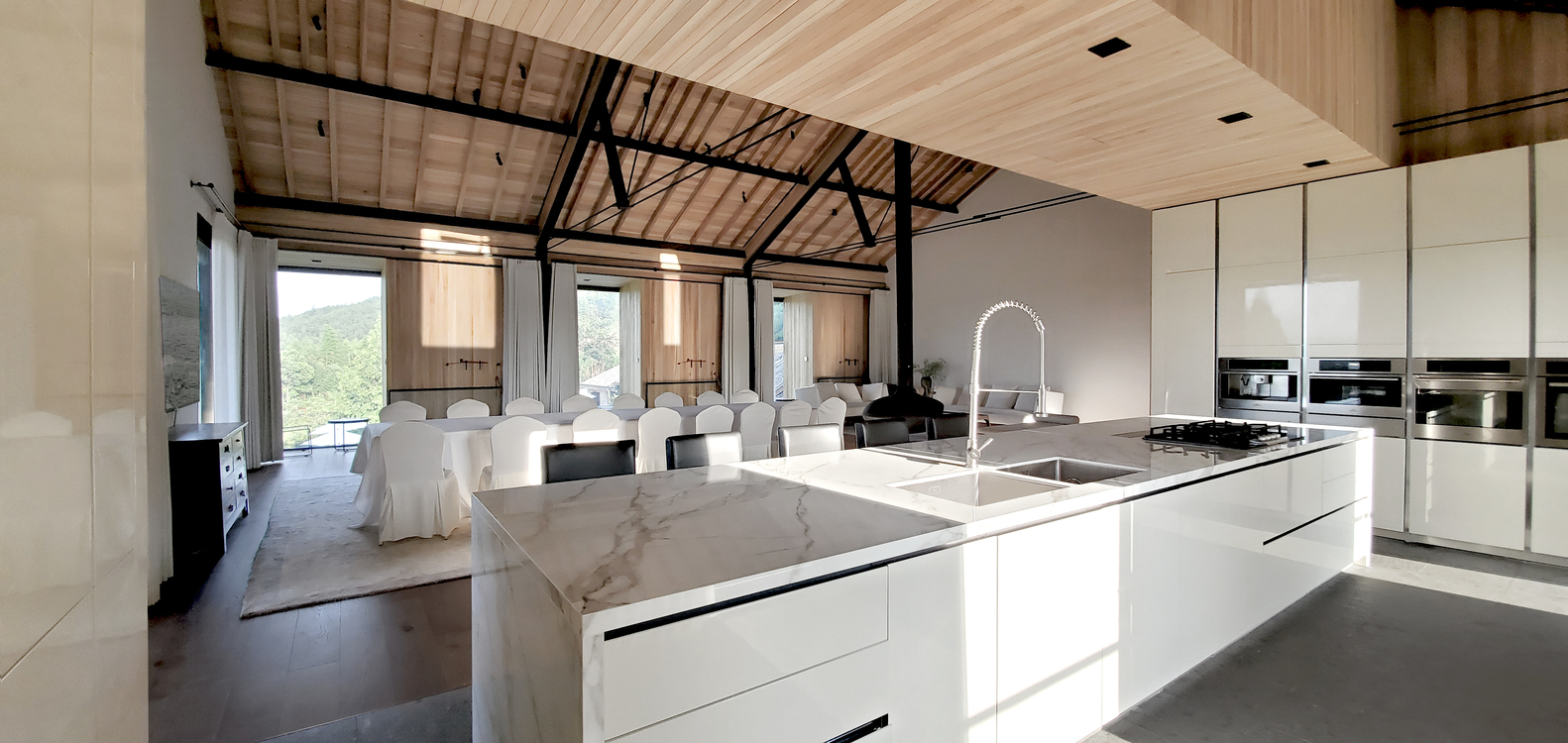 屋顶通过木椽与钢结构的组合结构来实现超长跨度,结构外露的形式,为项目的公共区域创造自由阔达的空间体验。建筑的南侧同时设有有顶露台,为使用者提供视野开阔的观景区。