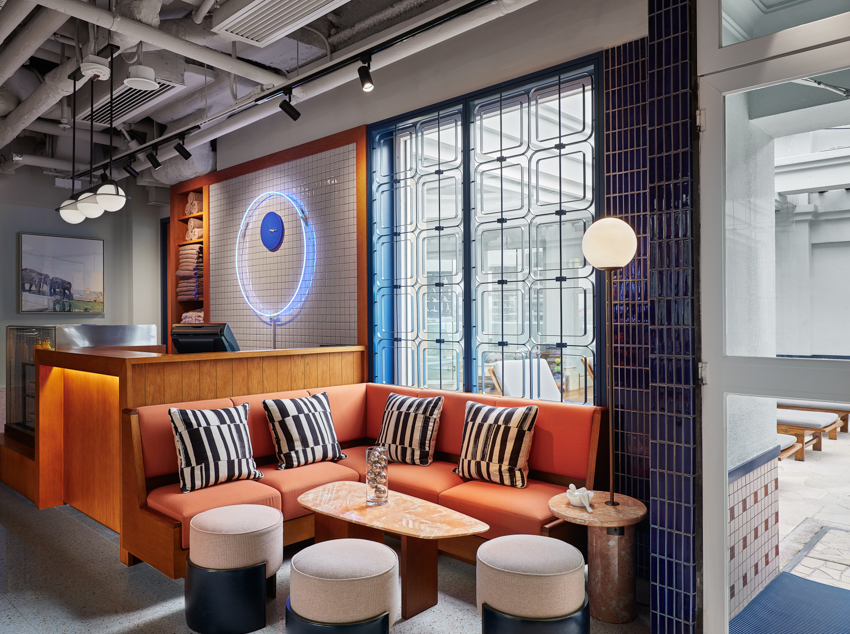 设计团队从佐敦道周边的街区提取元素,将金属制品、质地粗犷的水磨石、霓虹灯照明以及色彩丰富且图案多变的瓷砖遍布整个酒店空间。以粉末喷涂的红色钢制细部呼应了当地的政府建筑。定制的灯具采用了亚麻和钢铁等低调的材料,其细部的灵感源于郊区常见的竹制棚架。边角圆润的内饰在向传统致敬的同时兼具了时尚感,使酒店整体上呈现出面向未来的感觉。