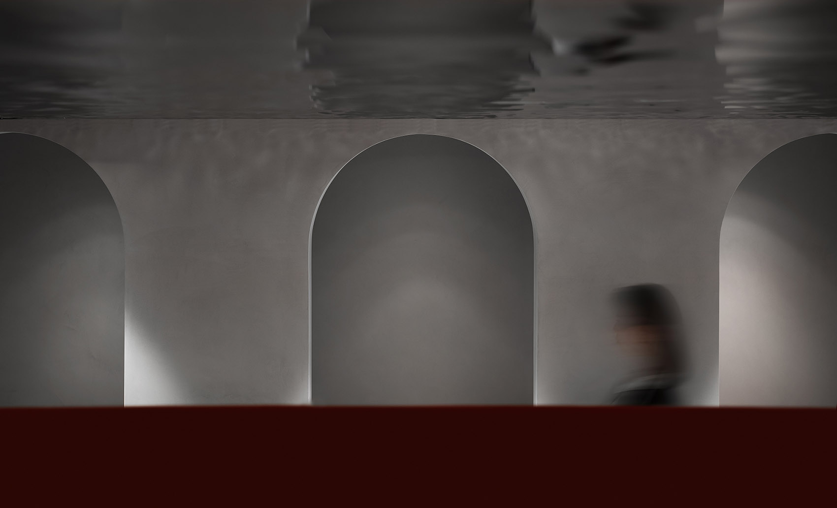 几何形于弧线的组织,构成了空间丰富的表情,于视觉错像。整体空间用守规矩的方体进行阐述,顶面以及更衣间的弧形门洞打破了空间的平静,并且给空间带来了女性调皮的性格。夹层只有2.2米的高度,空间采用波纹镜面质感,解决空间压抑的条件,模糊了空间的界限。空间整体呈现中性的灰色系水泥质感,红色成为了空间的唯一色彩,形成强烈的视觉反差。留下强烈的品牌记忆。