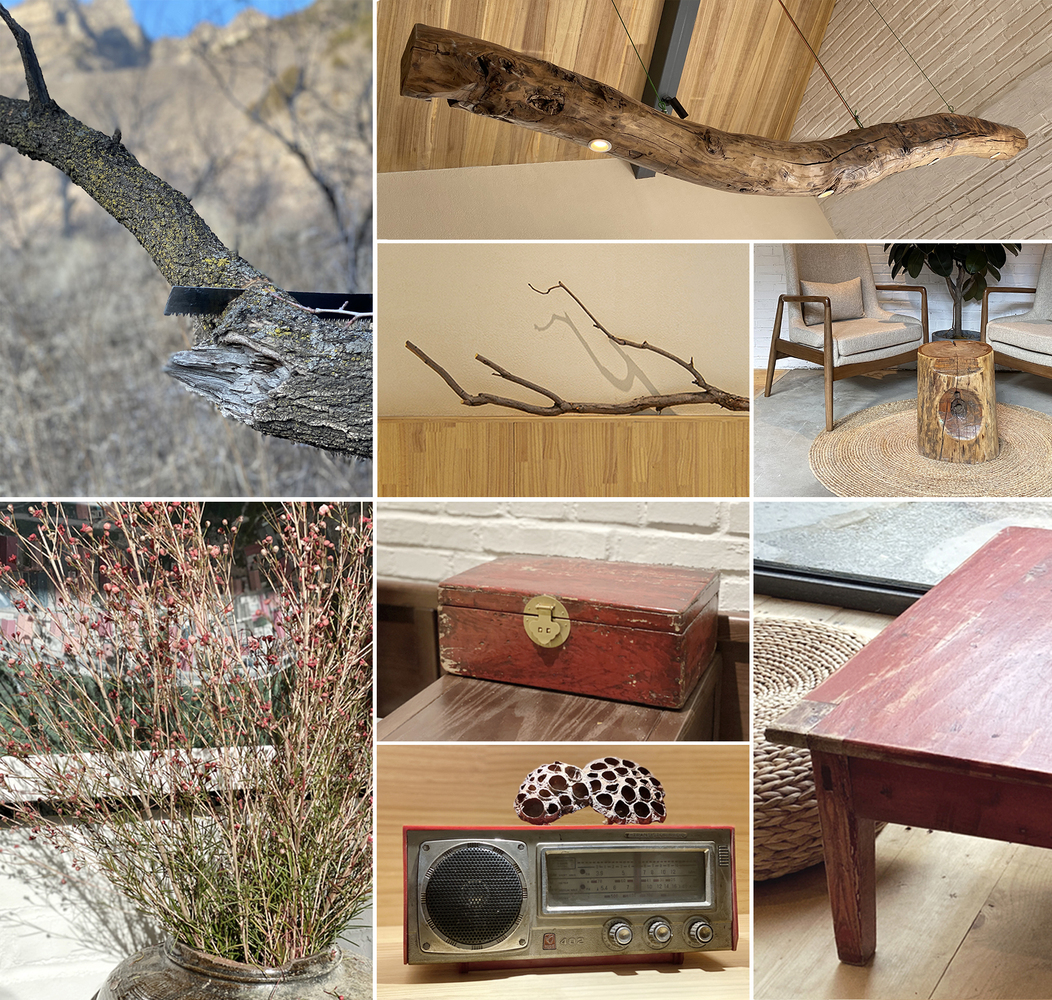 餐厅是人们公共活动的主要使用空间,在设计中以人的行为活动考虑动线设计和空间营造。设计将餐厅与后院作为整体考虑,将相连的门改为折叠门,当门全部打开,餐厅与后院相互渗透,形成了宽敞的聚会活动空间。对老宅的设计改造一直以空间结构的在地性、材料的在地性为原则,让老宅更好的融合在村落整体风貌中。室内设计的细节之处体现着设计师的用心,悬挂的装饰画都是设计师精心拍摄的艺术作品,是对小龙门村落场景的记忆;手作的石槽台盆,更彰显出手作匠人的坚韧精神。餐厅悬挂的装饰灯、床头的枯枝、房间的木墩,这些软装多取自于小龙门山上的原始材料,充分体现其在地性。