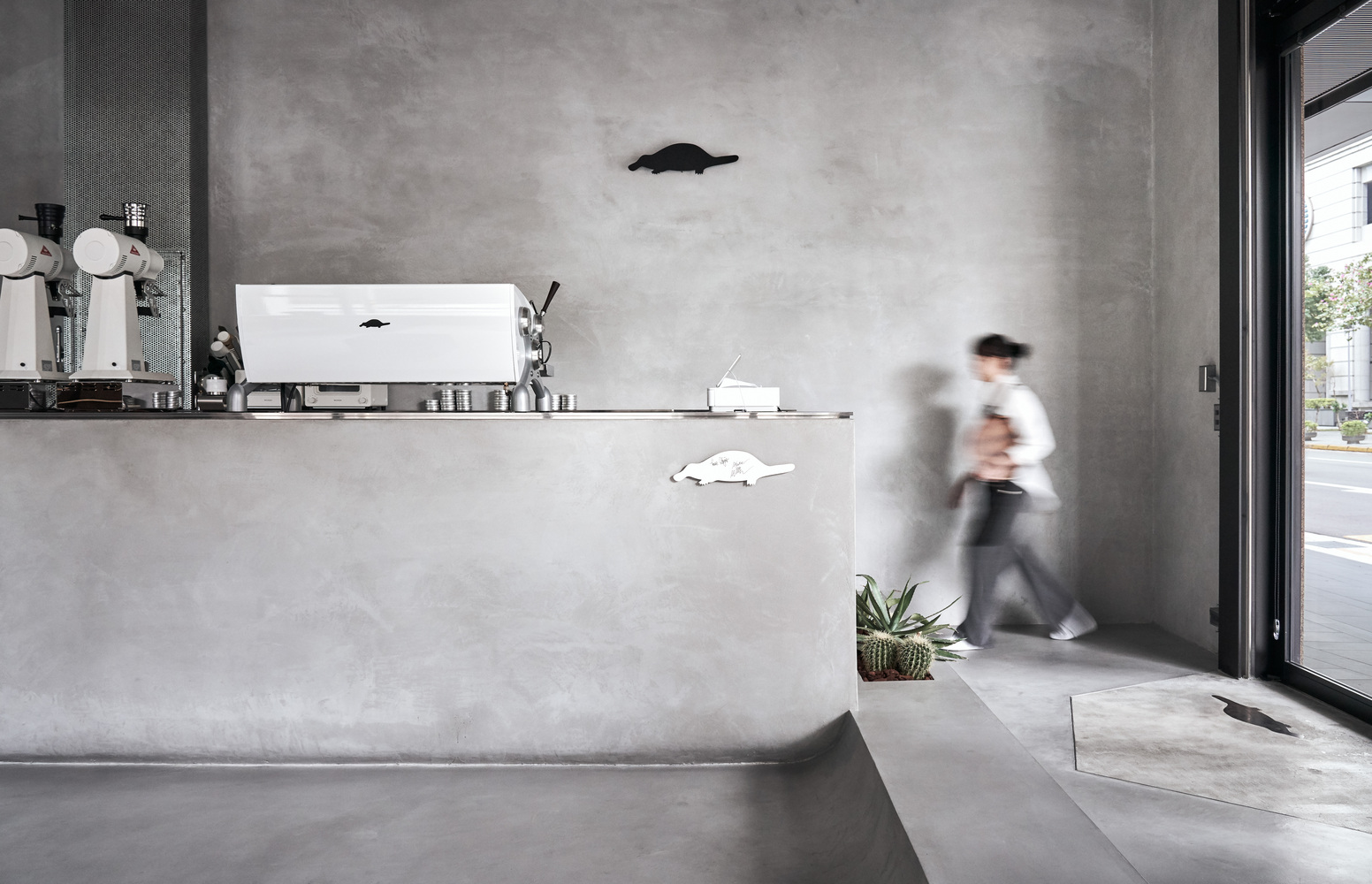 另外我们在空间中的风化木上结合展示功能,弯曲的地景则摆放可随需求移动的座位。客人散坐与风化木及仙人掌的包围之中,正对着隆起的咖啡吧台,观赏着咖啡师在空间中的演出。