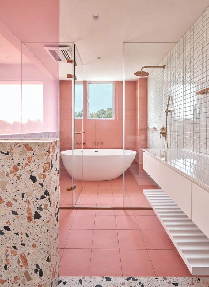 本案为座落滨海的三层楼独栋建筑,作为度假使用要能让他与三只爱猫一同放松玩乐。为了打造纯粹的粉红空间,我们以粉红色矿物漆作为壁面及天花基底,并挑选偏向自然色调的各种不同粉红材质,去构成混合的风格。