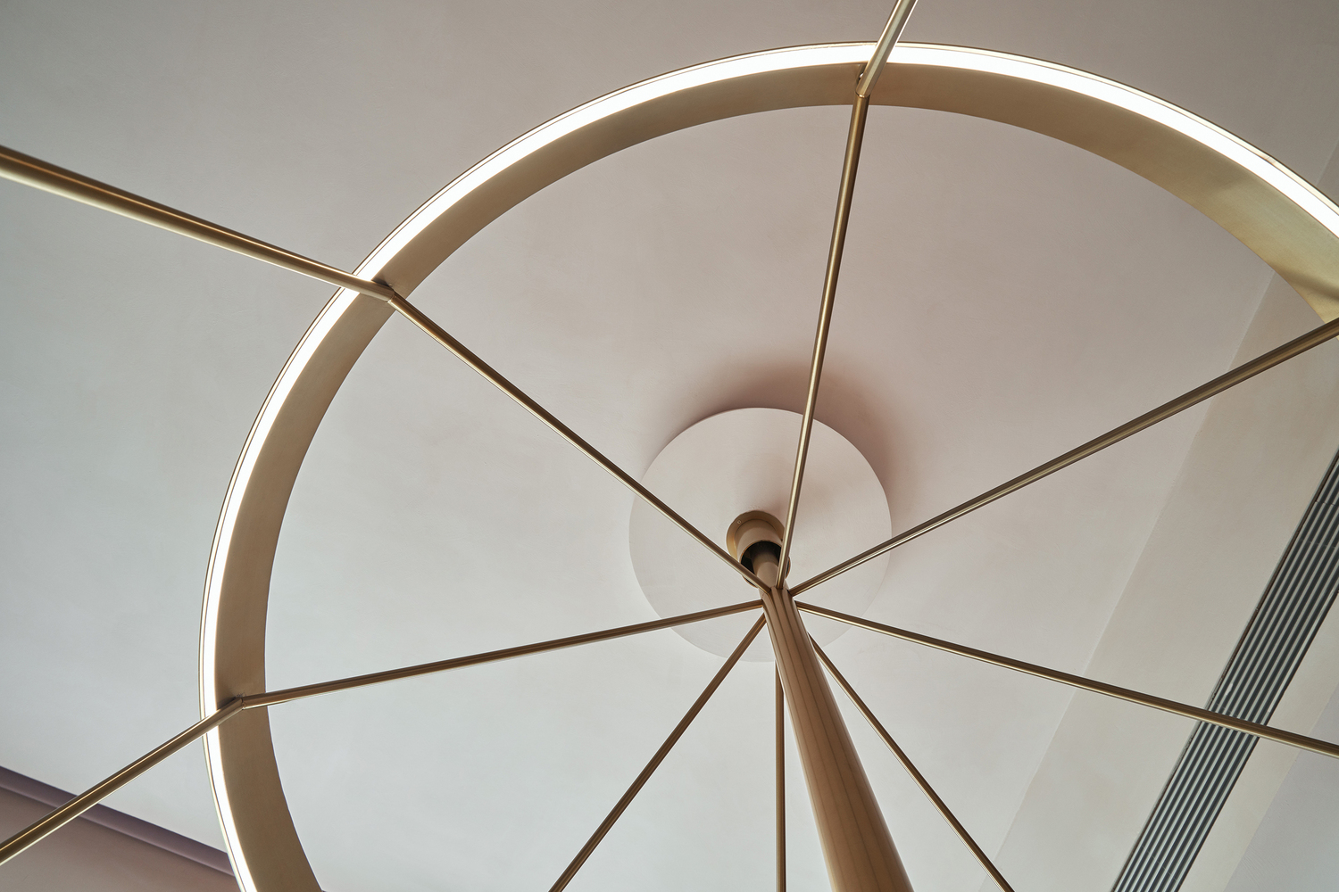 - 空间主材:水磨石、玫瑰金不锈钢、玫瑰金钢网、黄铜、木饰面、木地板、粉红色矿物漆、水泥漆、彩色玻璃、大理石、瓷砖、镜面玻璃、粉色氟碳喷漆钢板、肌理涂料