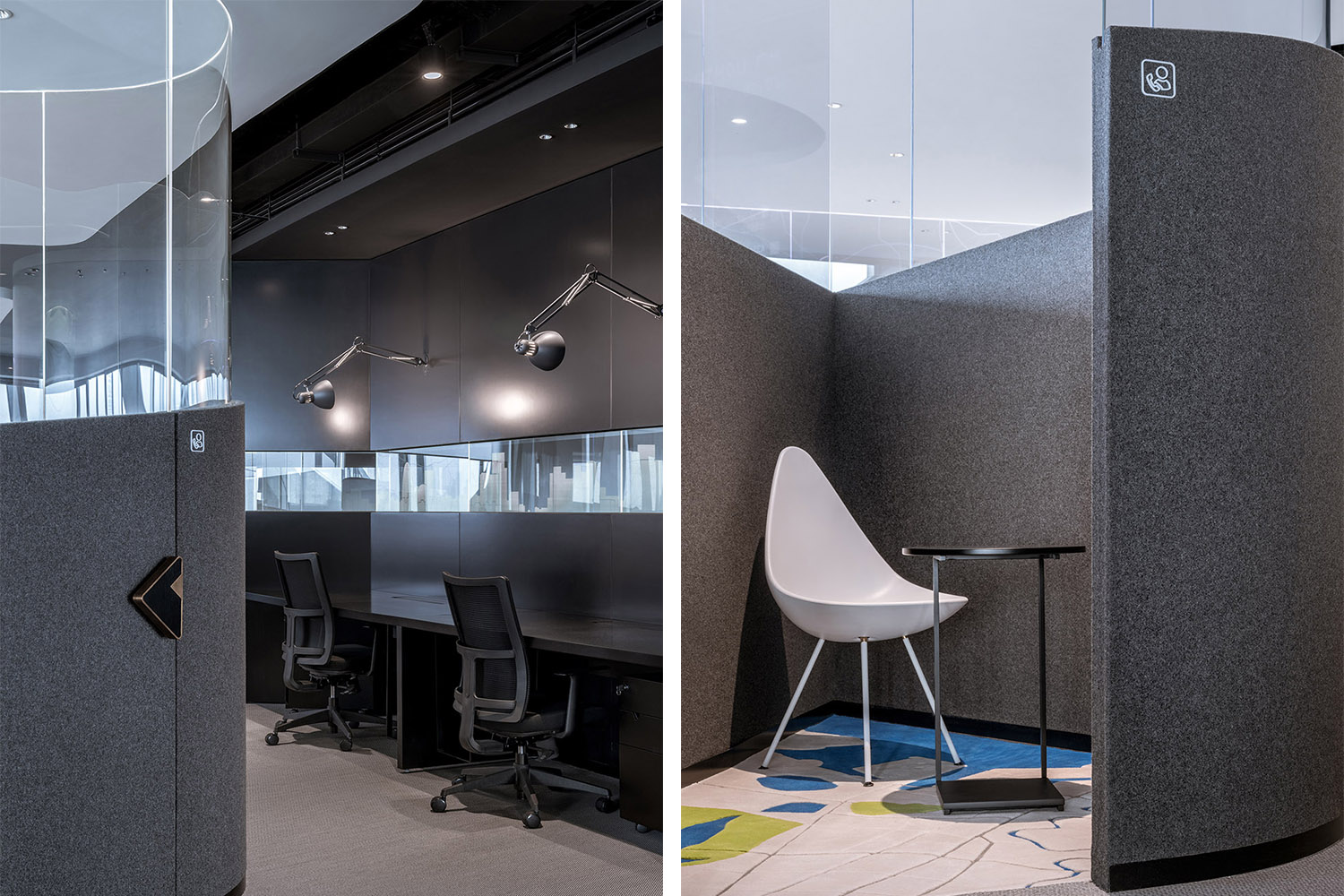开放与私密:三角形的桌椅布局与RayData的logo形成呼应,同时作为统一的设计语言从视觉上连接了整个楼层的所有区域。该元素也出现在门把手、家具和灯具等细节方面。