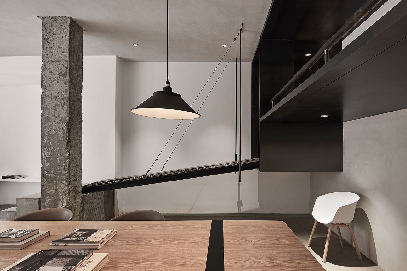 材质的变化:在整个空间中运用了大量的钢板,钢板材质会随着时间慢慢的被氧化在其表面会留下斑驳的时间印记,水泥和原木也是整个空间必不可少的基调。楼梯的材质我们通过虚实结合的方式让整条动线的节奏和触感更为丰富,首先是起始的水泥阶梯的(实),接着是悬空吊桥的(虚), 然后是夹层木头板(暖),最后悬空钢板的(轻),这样的层层组合形成丰富感知体验空间。