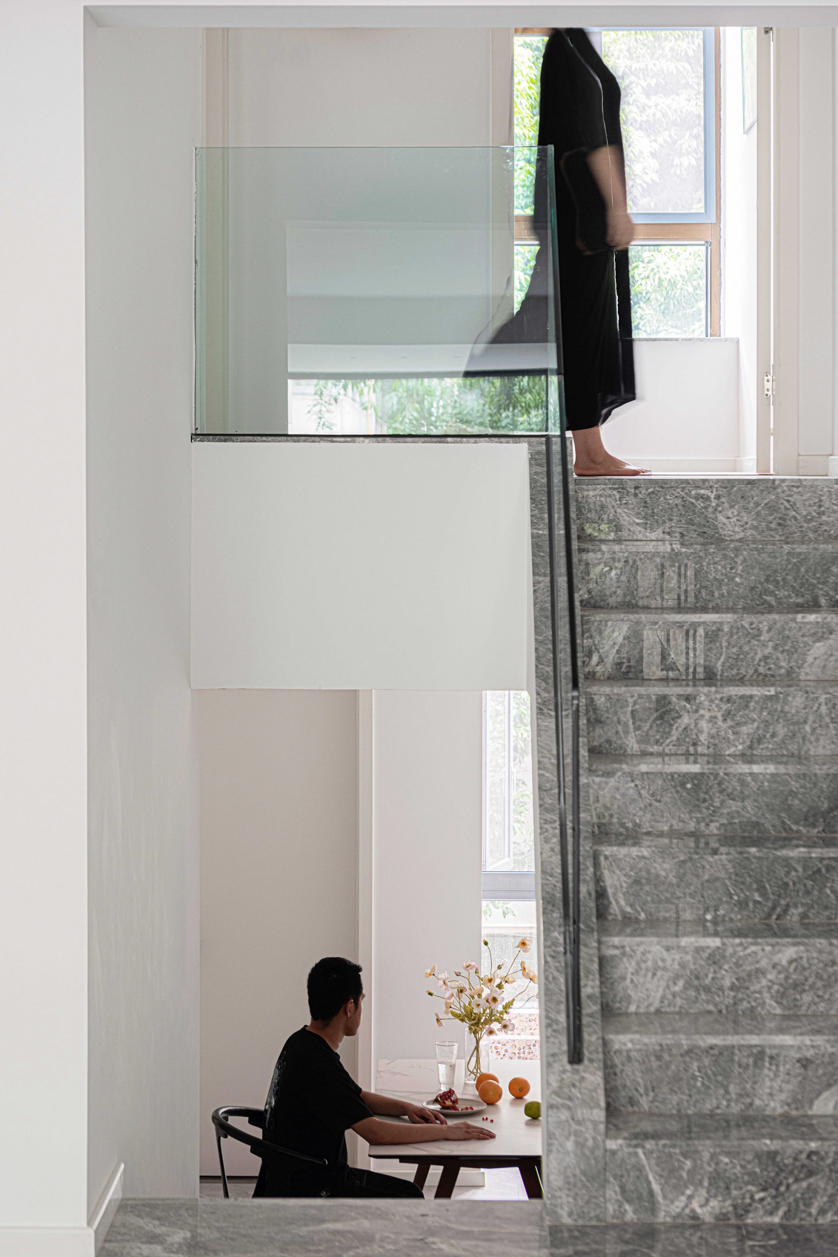 整个设计的最大的趣味点是走廊楼梯部分,楼梯呈Y字型将空间串联在一起,将整个户型分为三个区域。