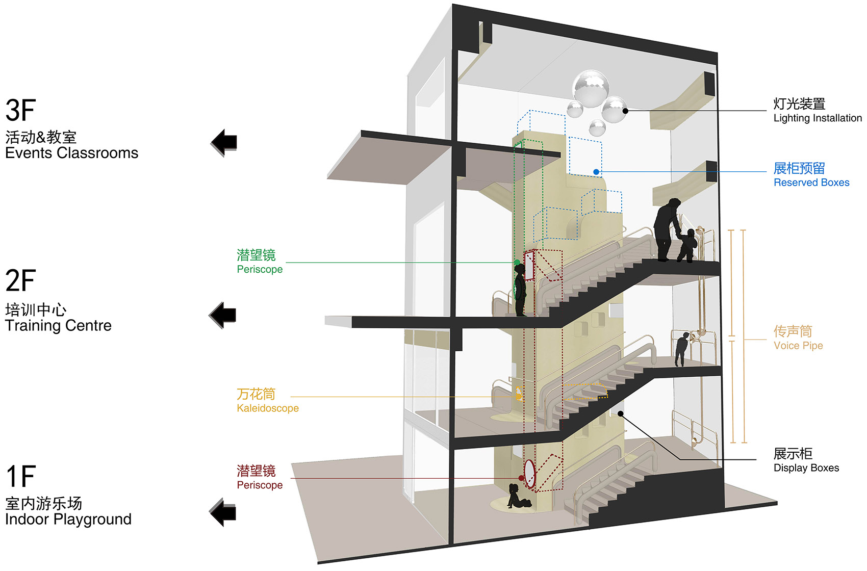 项目所在空间原为商铺,空间朝北且层高较低。未/WAY Studio的设计方案通过半开放的空间布局,灵活的家具组合与丰富的灯光设计带来了采光充分、通透且充满弹性的室内空间,保证教育空间所需的通风、温度和空气质量条件。一二层相连的楼梯转角还设置了一个反光镜,让孩子们可以在二层看见一层空间内的活动。一组金属喇叭将上下空间连接,让孩子们可以“打电话”。