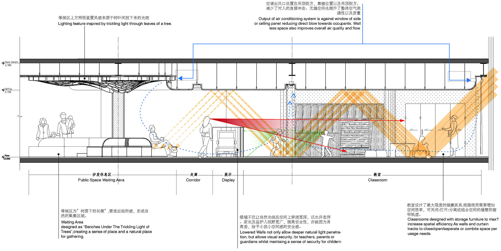 教室里,家具作为墙体,融合了所有教学或者其他功能转换时需要使用的设施。教室内的灯具像小朋友的三颗小牙,可调节明暗度,满足白天、夜晚、清洁三种模式的灯光需求。