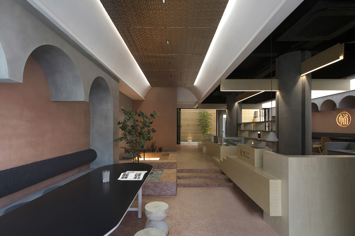 空间两侧墙面连续拱券的体块,连接天花的拱顶,营造出一条回行拱券廊道的空间意象。增强了空间的层次感和视觉上的延伸感,从而弱化了空间的界限。