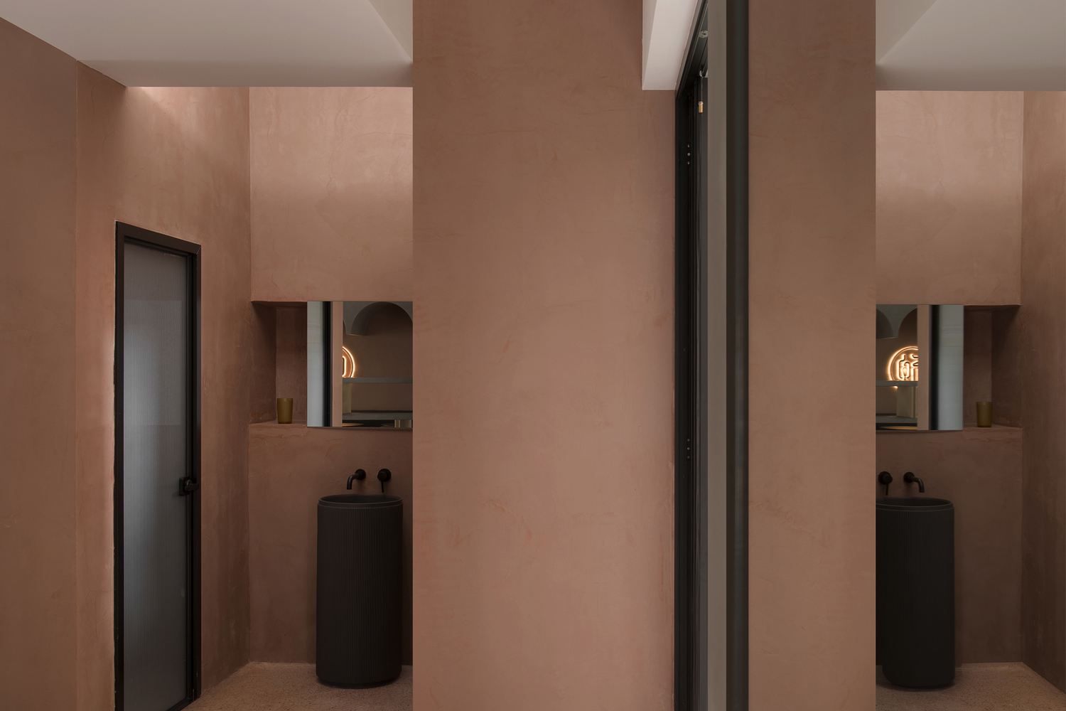 为了营造“园”的氛围,我们选用了现场浇筑的陶土红水磨石作为地面材质,墙面则运用了水泥灰和陶土红的手工漆。水磨石和手工漆能很好地塑造了空间的体块感,手作的方式也与业主的经营理念契合。