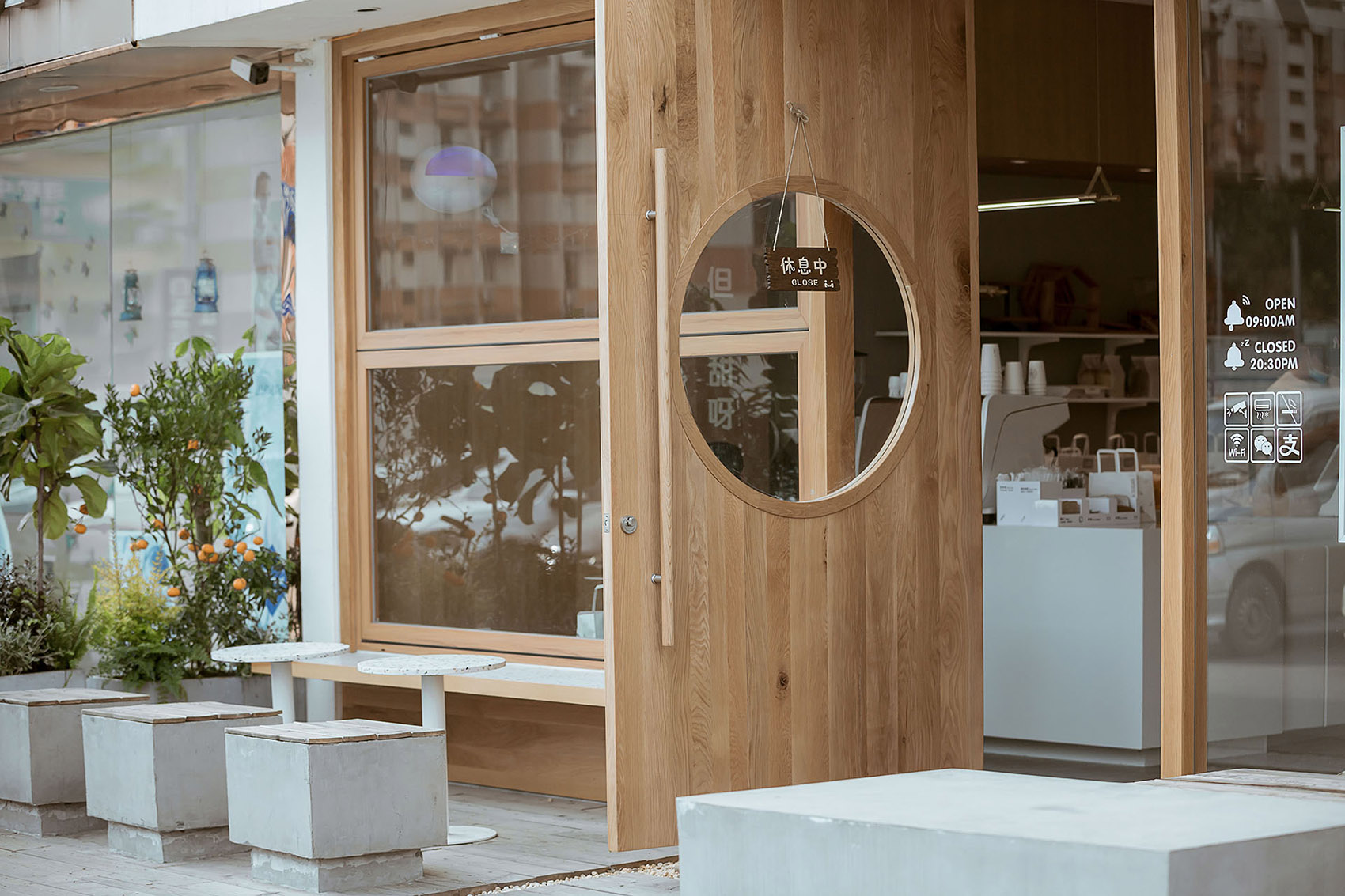 店铺外摆的⽯凳及L形座椅和基底的⽊板及透⽔⽯⼦的地⾯铺设,在体现设计的精巧之余,拉近店铺与附近街区的距离,并为来此的顾客提供多样化的消费休闲空间。