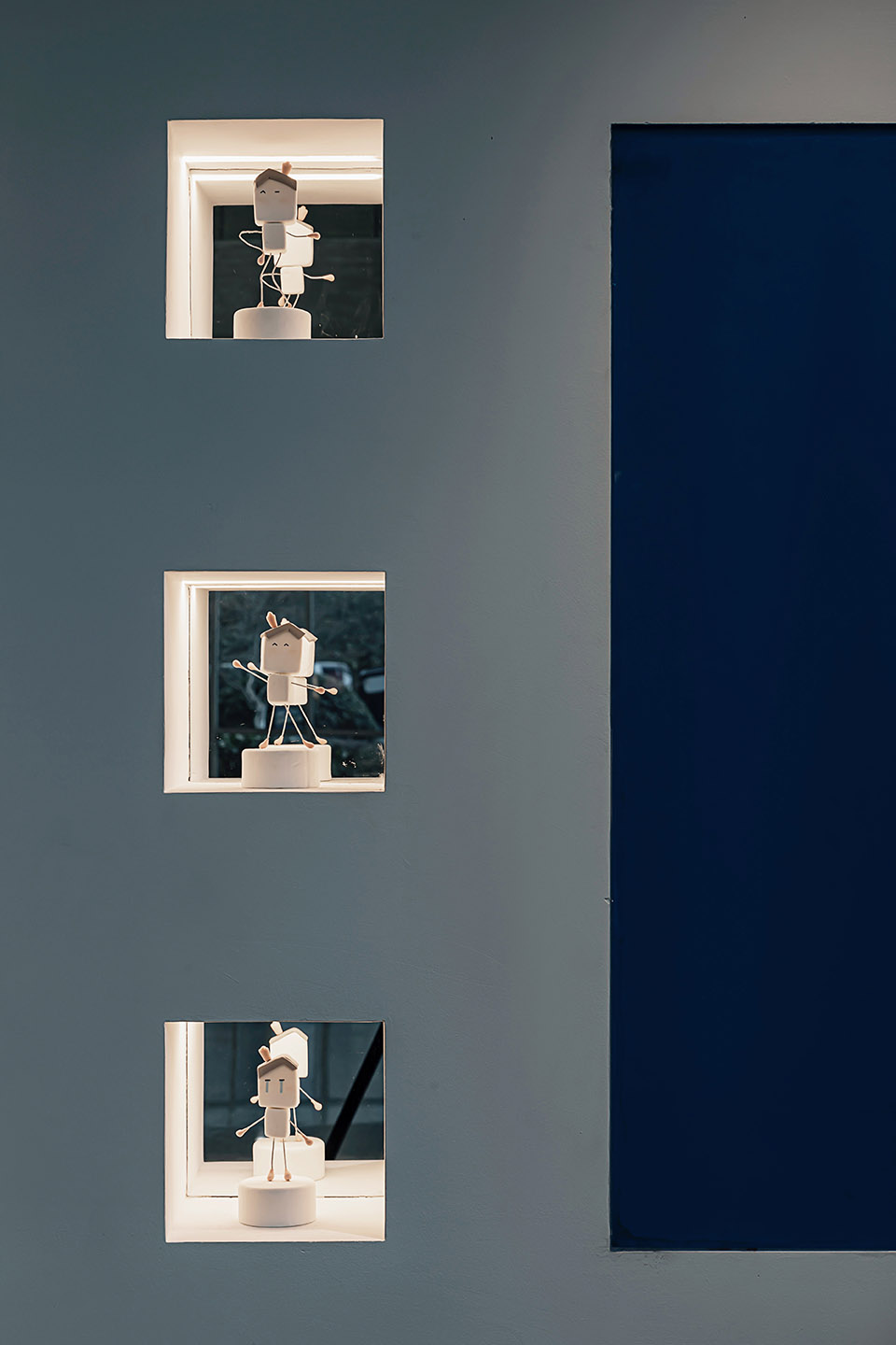 室内外的完美结合在于材质上的运用,室内空间三面皆用黏土材质,保证质朴美感之余,也能和户外产生更好的融合关系。软装的选择结合了亚克力材质的蓝色,增加了灰蓝色椅点缀空间,木质,铁艺石材桌,灯具为玻璃材质。为了增加翻糖展示,展示区立面以洞窟形式陈列大小不一创意蛋糕,设计上保持初衷,倾向采纳自然元素。