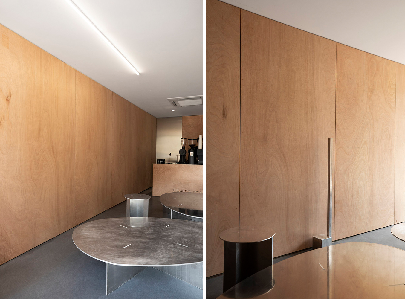 设计建立一个开放的休息位,客人背对背围坐在精简的悬浮薄片上享用咖啡。通过铝型板材数控机床精准切割成两片弧形并镂空十字插口,依靠10mm铝材穿插咬合及自身重量使之牢固,我们认为这种悬浮和切片拼贴感可以抵消四面木质纹理的分量,使咖啡店更轻薄自然。同时两片漂浮的座位可以承载ooffee 作为展览空间的需要,可以作为举办小众书籍推广和售卖,摄影沙龙及相关艺术活动的道具,寻求咖啡空间成为替代空间的多样性,为不同的创意人士提供陈列表达和展示机会的实验平台。