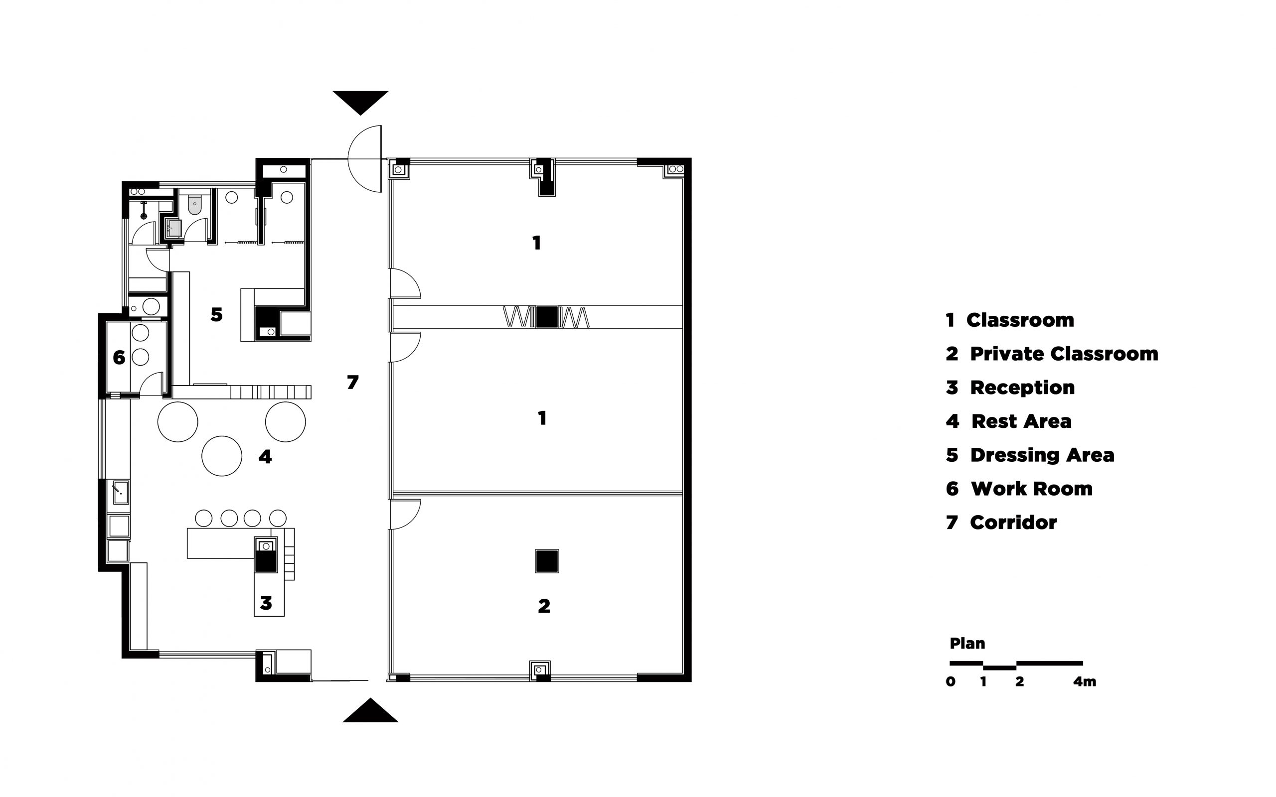 普拉提练习馆在设计之初就摒弃了各种有色元素的介入,色彩是用来调动情绪的。普拉提作为一项需要参与者极其专注的运动,首先应该做到的就是让整个空间氛围处于一种“平淡如水”的状态,以帮助学员更快速地集中注意力投入到练习中去。前台部分采用白色石材与木饰面、水泥纤维板相互融合的方式,在天花部分吊挂的白色金属圆环,象征了普拉提训练的正向和包容。