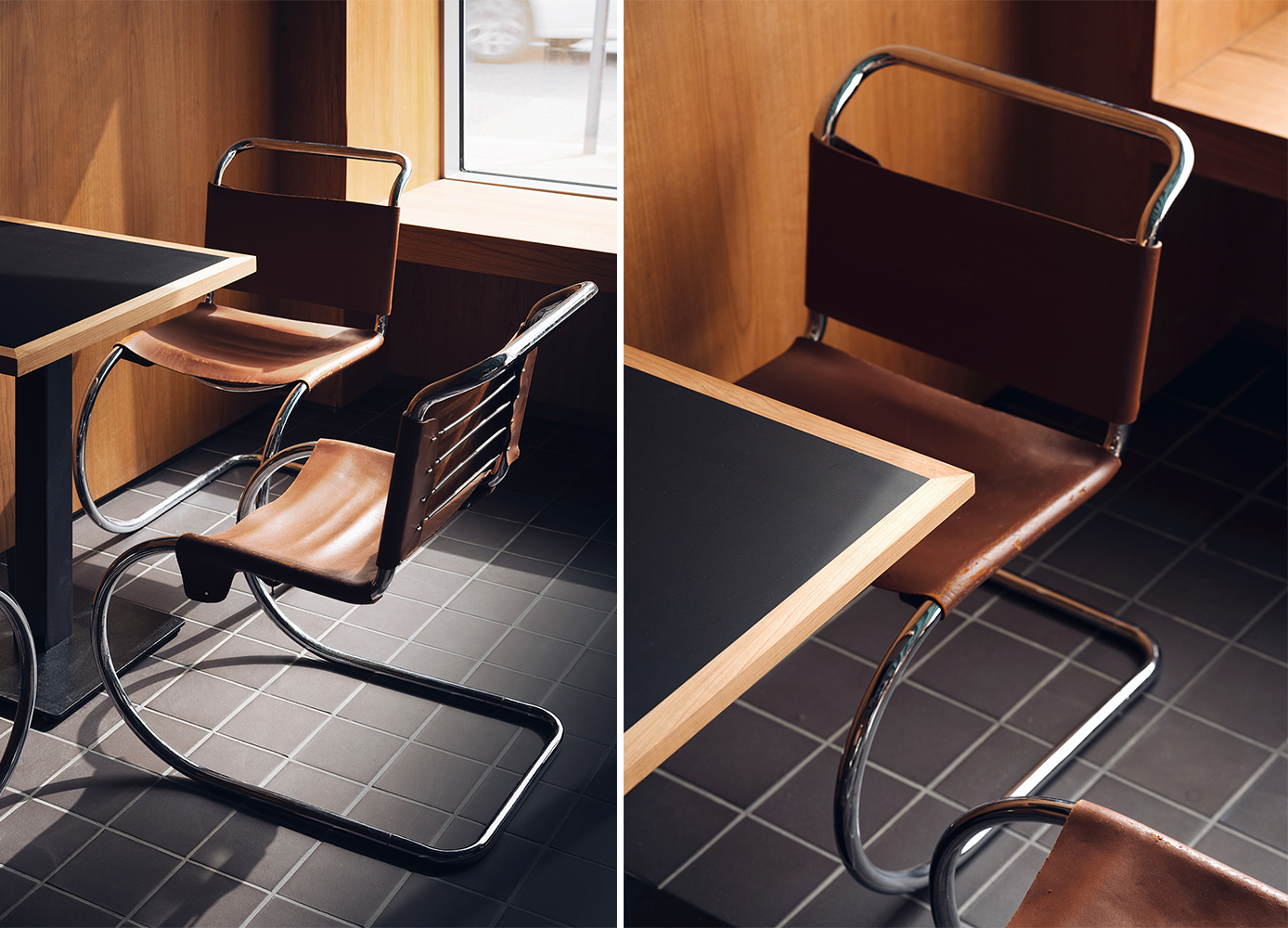设计师用一系列世纪中叶的经典作品装饰餐厅,包括密斯·凡·德罗设计的MR10复古管制钢椅以及诺曼·钱尔设计的胶合板椅。灯具采用盖·奥兰蒂1965年设计的Pipistrello台灯和意大利制造商Stilnovo生产的复古壁灯。