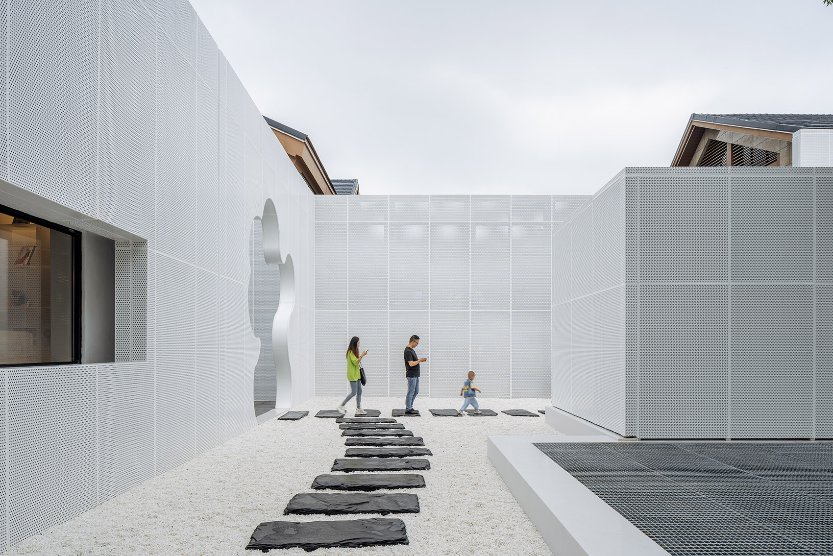 树形的搭配和组织是借鉴了我热爱的大画家倪瓒的构图。但庭院所表现的白石头和绿植很容易让人联系到日式的枯山水庭院。但这个灵感来自于仇英的《园林胜景图》中的一个关于中国枯山水的片段。画中一株勃勃生机的蔷薇花矗立在宽广的模仿波光粼粼的白色石作地面上,简洁疏阔。画中的庭院是竹帘围合而成,而我用白色穿孔铝板,一样封闭了一个半透明的庭院。光线可以经过围墙的筛漏而如雨点洒落庭院形成斑驳的光影而增加了庭院的生动。这个庭院不求传统园林的形式,而是传递出中国人热爱在人世间的最拥挤处创造一个生机勃勃人间仙境,即所谓桃花源。也是当代人的真实的梦境。