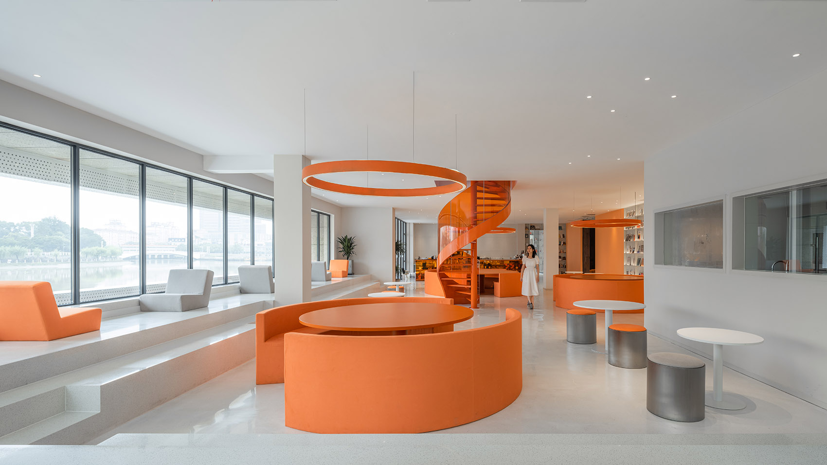 意外的是在咖啡区(榭),橘色的家具更像涟漪。而在临窗的高台上沙发上发呆,江水水平如画卷展开,一种中国画形成的时间观意外的复生了,吻合了我第一次站在江边时的那个情绪。由于屋面板下多余的结构次梁,我无法在收银台天花上开设天光,让水面和天空成一色。只能以发光天棚代替,少了一种光线组合,略微有些遗憾。