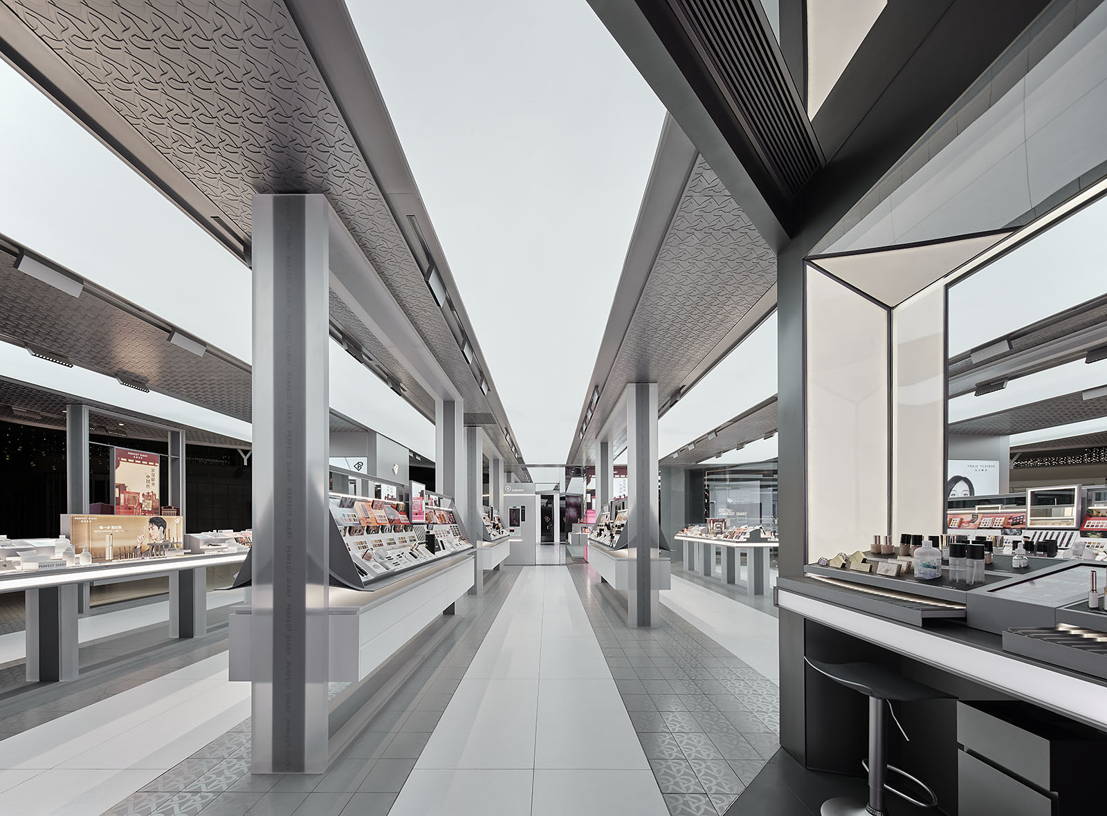 以轻盈通透的货架承载产品展示作为空间主要元素,通过有序的排列,串联起各个区块,让消费者的视觉和体验更加聚焦在琳琅满目的美妆产品上,更赋予了消费者自发探索和无拘束的购物体验。