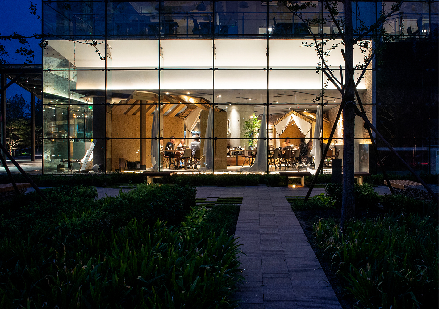 两面完整的玻璃幕墙,在昼与夜发挥着不同的作用。在白天,它们将室外室内化,把外部的四季园林引入室内;在夜晚,它们将室内室外化,把内部的画面展现给外部环境,吸引人流进入。在不同的时间段呈现出不同的就餐氛围。