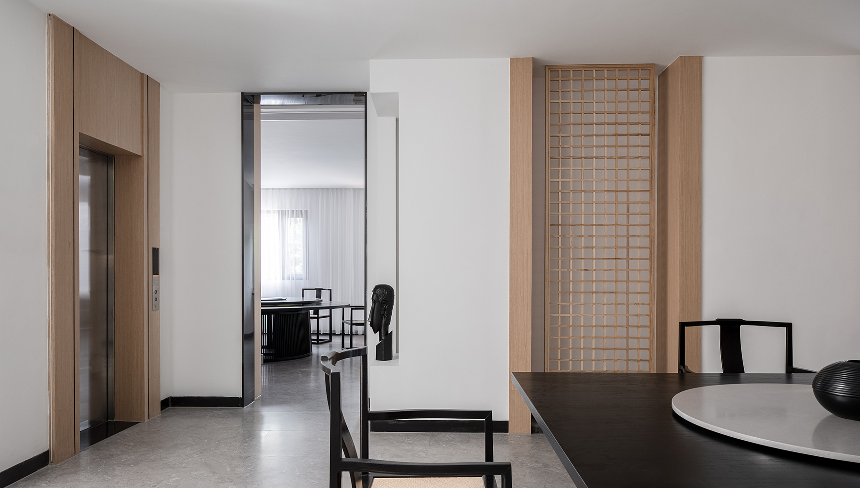 在墙这类实隔上覆以小格子线条勾勒的木格栅,淡化了边界存在感,韬藏本真之美的原木、玻璃与小面积石材,藉由种种素朴无銮素材,让场域递送着一派和润素拙的味道。