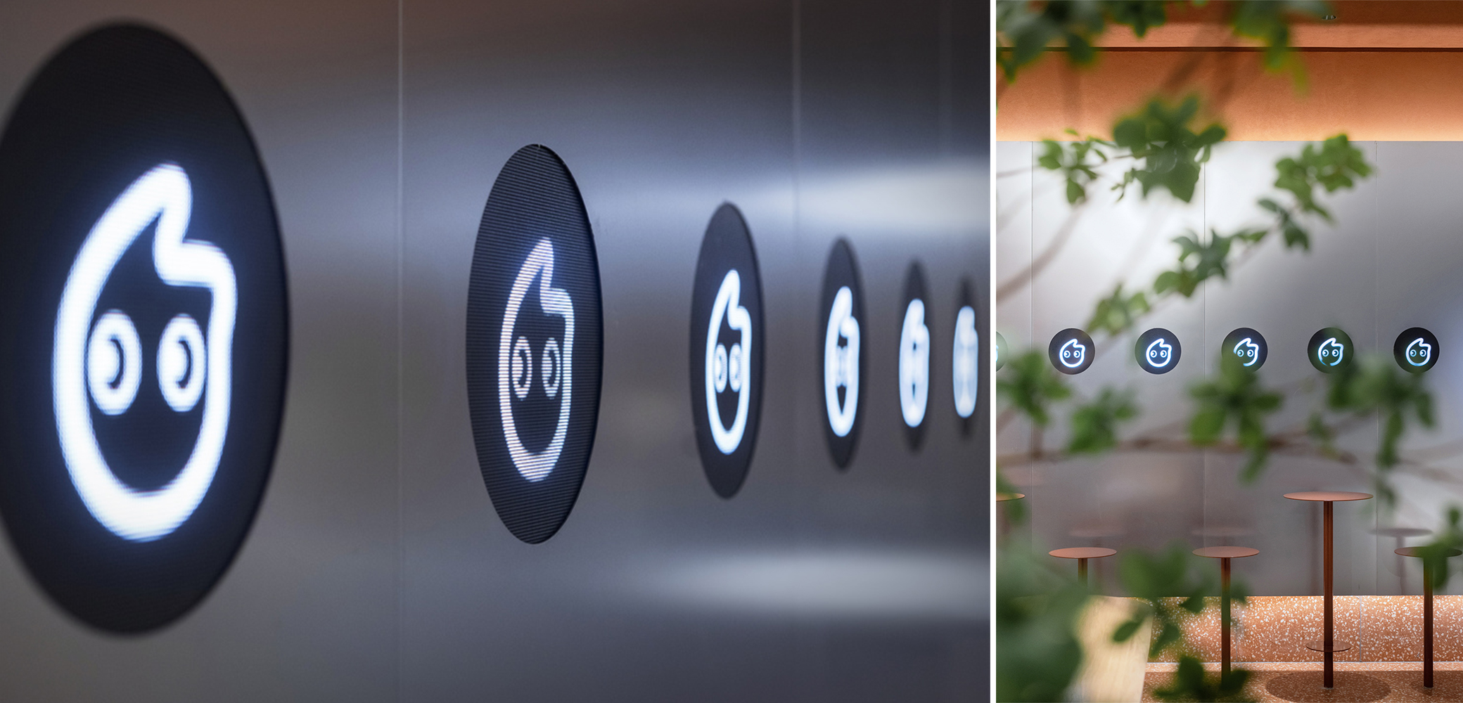 移步到店内转角处,随自然光线渐弱,空间由明至暗、从动到静。当客人就坐于拔地而起的坐位时,能与墙上的小精灵头有更亲密的互动,精灵头在连串的小圆洞里穿梭跳动,让人欢喜,会心一笑。