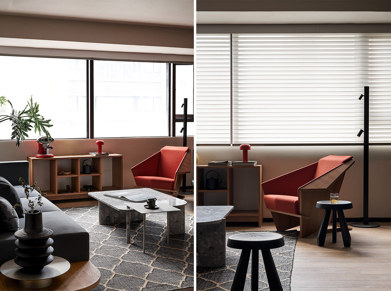 推门进来便能看到黑色电视背景墙映衬下的一抹亮丽的橘红色,勾勒出一个舒适而安静的角落,这款由弗兰克· 劳埃德· 赖特设计于1949年的几何形Taliesin1扶手椅在2018年被Cassina再次推出。