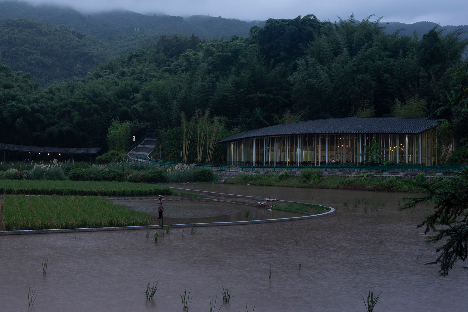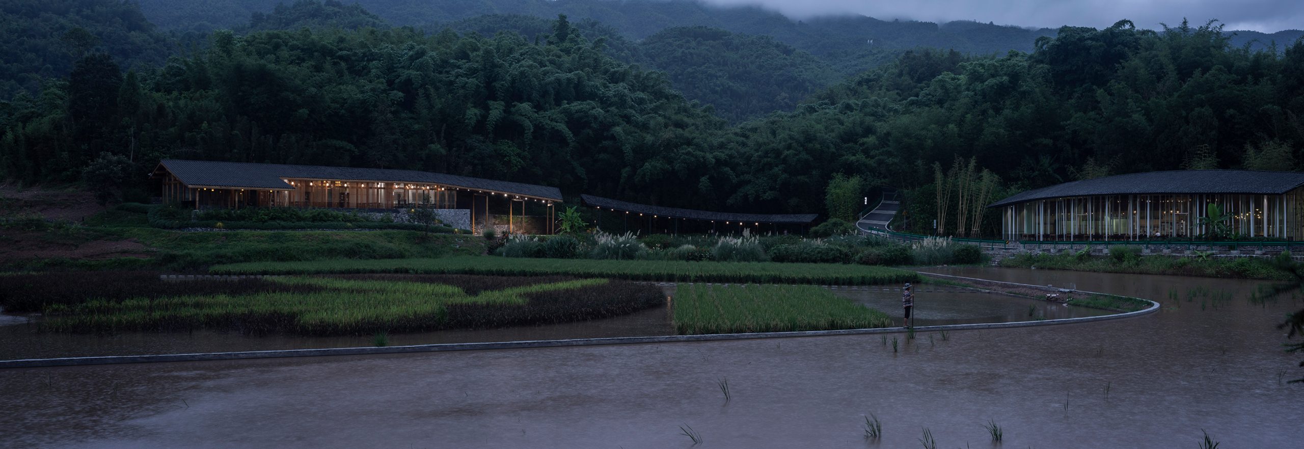 川南地区有着浓郁的竹林村落传统人居文化,“一田、一房、一院”是其典型格局,房前屋后必有竹林相伴。牟巘五的《题水竹居》中写道:“绕屋清波隔翠绡,鱼鳞发发鸟悠清。画阑影漾清涟动,书几阴来绿雨摇。”几乎是项目整体意境的真实写照。“绕屋”即延绵起伏的建筑形态,“画阑影漾”即变化丰富的檐廊,“书几”即是对书院功能的刻画。“隔翠绡、鸟悠清、清涟动、绿雨摇”更是建筑与竹林、飞鸟、水田、细雨等自然环境完美融合的生动描绘。