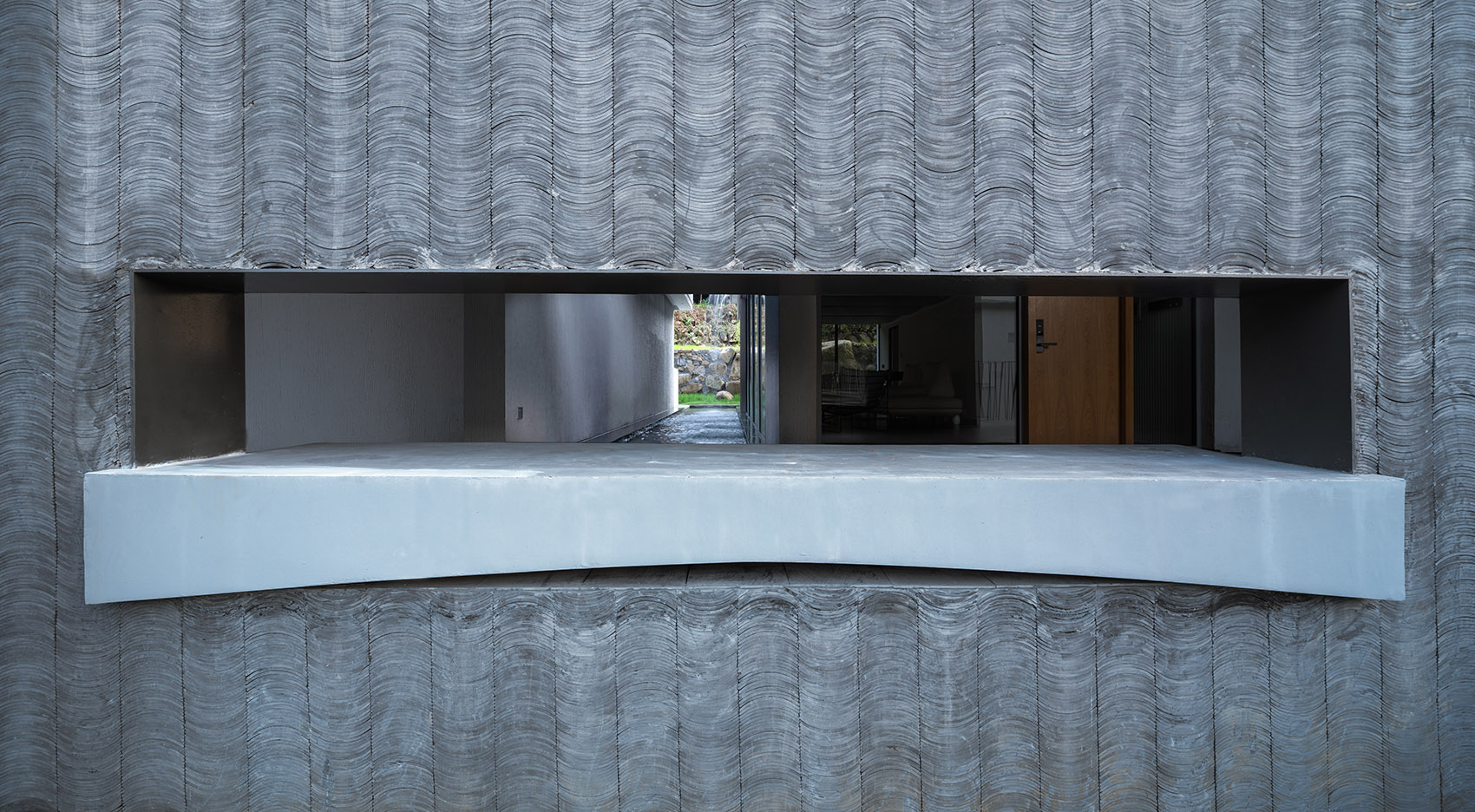 将屋顶高高举起,或从地面挺立或从墙边承托,水波形连续的屋顶是导水的容器,将原本均匀落下的雨滴汇聚成线性的水路。