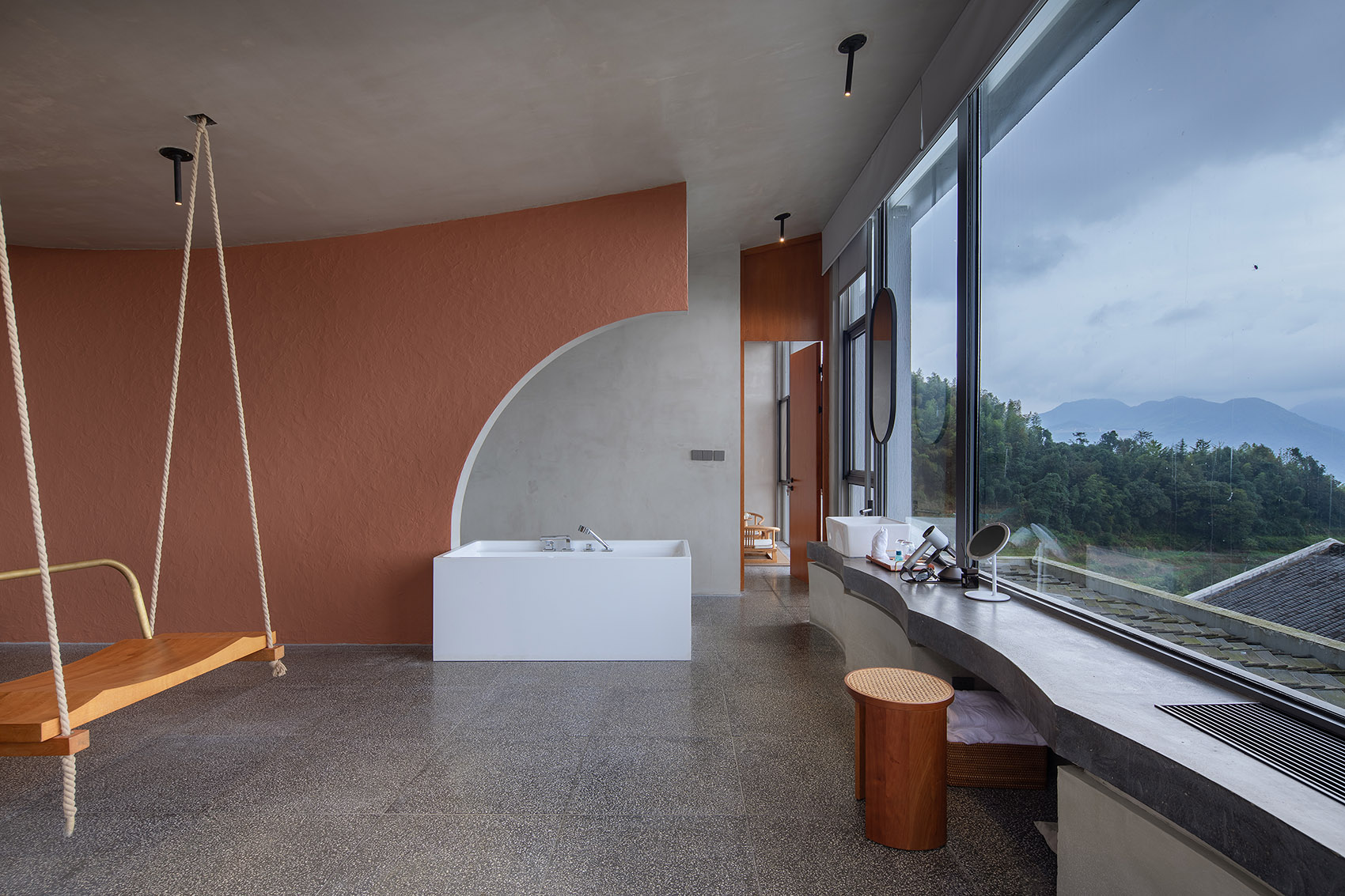 在雨屋的顶层,有一间四面通透的大山亭,在屋中,将远山和身体连结。在檐下,于心中,留一片山水。