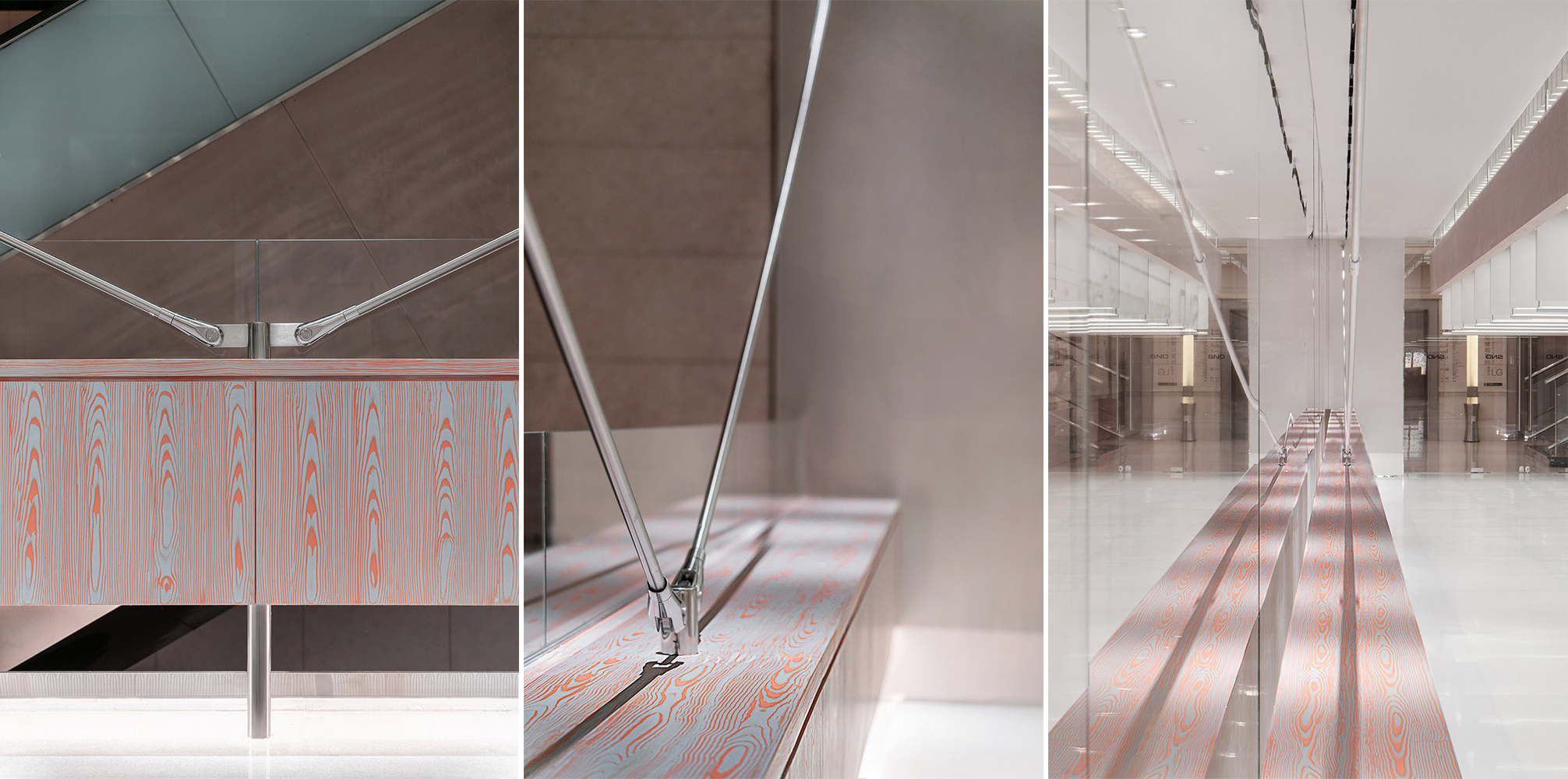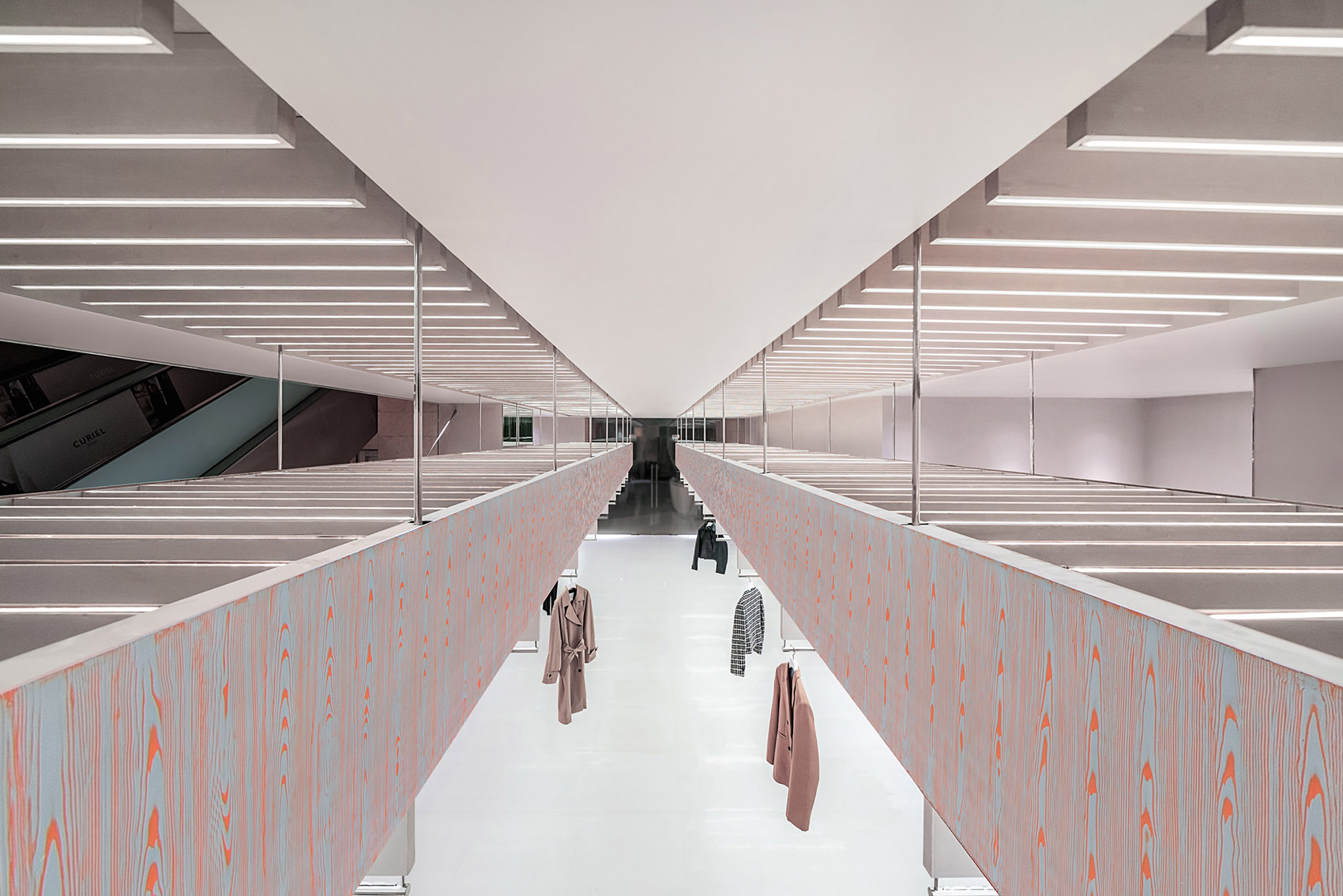 秩序感不是为了空间重复美学而出现,而是为了满足功能顺势而生;几百个品牌的系列组合决定了展示货品的丰富性。集合美观及功能一体的层板系统,在相等距离的层板下方以不锈钢杆以悬挂服饰,自然重力下垂挂的服饰在灯光下随着气流微微晃动,彰显灵动之感。