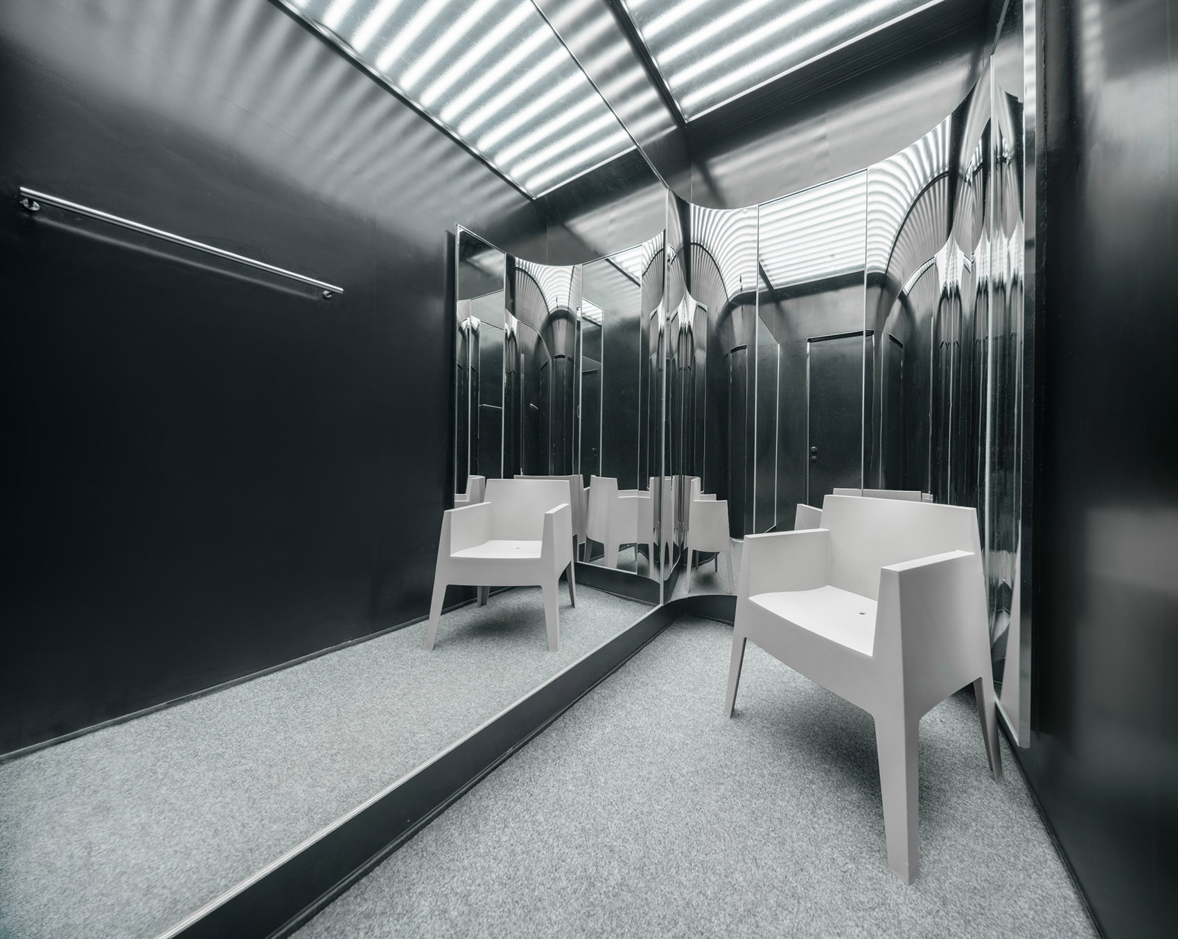 休息区不规则形态的椅子形式,如同路上偶遇的自然石头。试衣间与墙同色的门略显低调,打开后的空间与外部空间形成强大的反差感,如同你置身至于桥下某处桥洞里。深色光亮材质褪去空间的棱角,镜面反射使得空间成为可呼吸的神秘,在最具有话语权的光引领下,即便是小而简的空间,设计上仍然可以进行洒脱的表达。