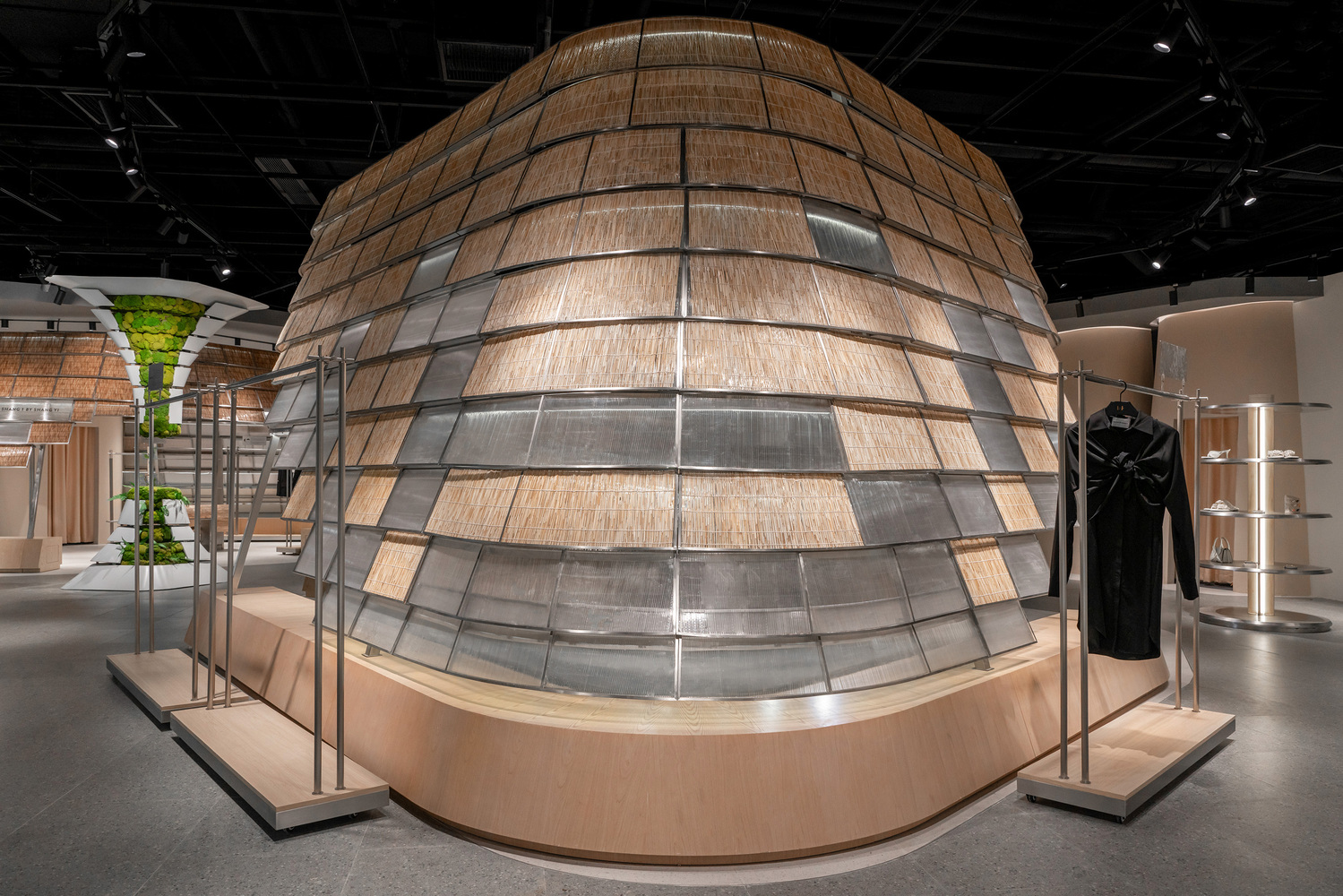 多边圆角形状的树屋既围合出一个个空间,又如同山石耸立,造就山谷延伸的外场空间。无论是植物与双曲铝板造型,亦或是芦苇与金属构件,人工材料与自然加工物之间的衔接与冲突,都体现着本次设计“人造自然”这一核心概念。精巧的金属表皮构件提供了一种转译后的“树皮棚屋”的构造可能,它将可能被运用在更多的室内外场景之中。金属制的展台与挂杆的局部也被嵌入了原生木头等自然物要素,适时保持人造与自然间的平衡。