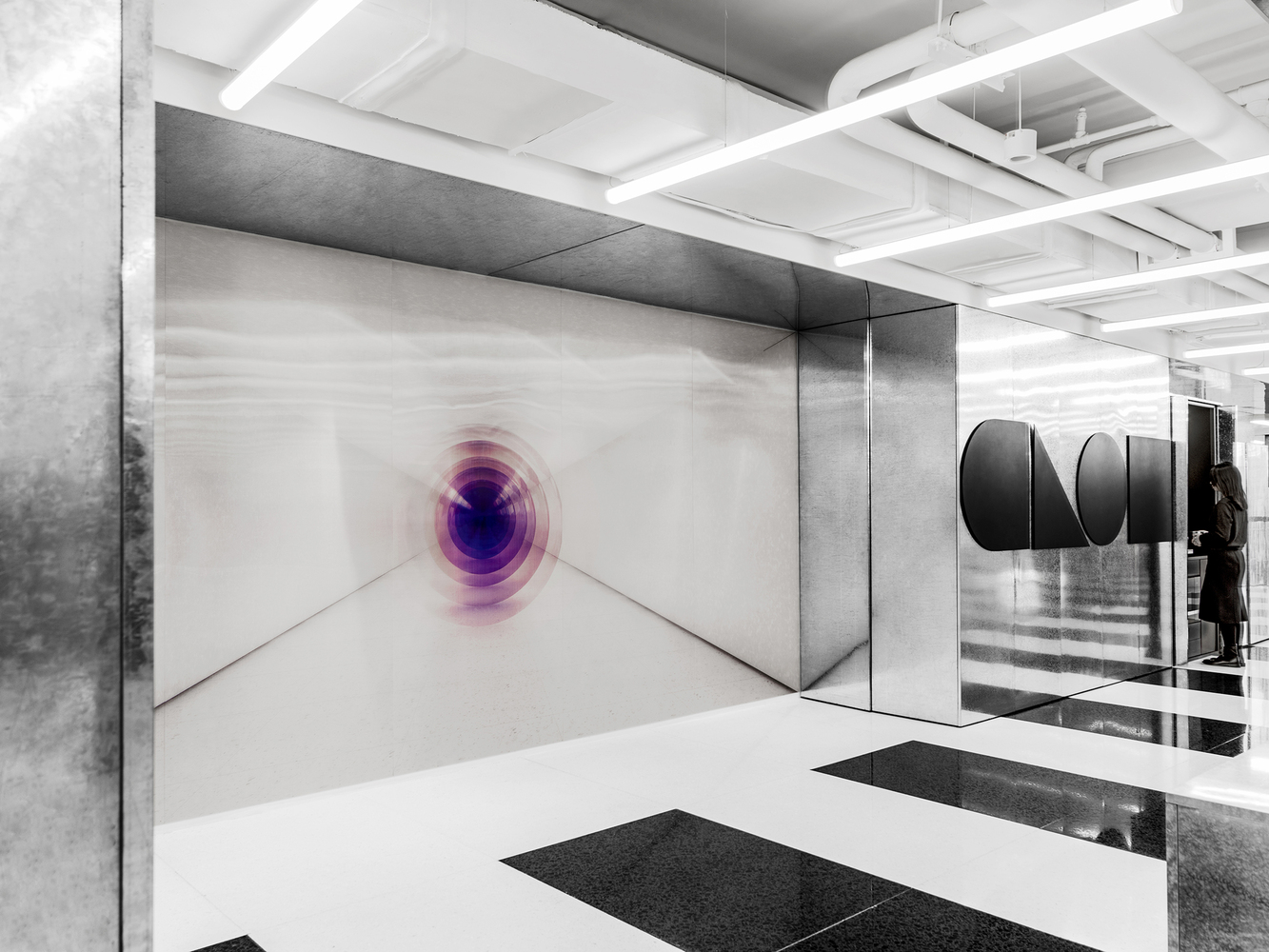 走进被镀锌板包裹天地的入口,映入眼帘的右手边为开放式办公区,左手侧为模型室,两大区域之间由一条阶梯式的展示区、前台公区及公共走廊相连结:CLOU 品牌的图形LOGO以各种不同材料、不同大小的形式呈现在三个区域的墙面上,黑色及银色的品牌LOGO昭示着事务所大胆的创意形象。